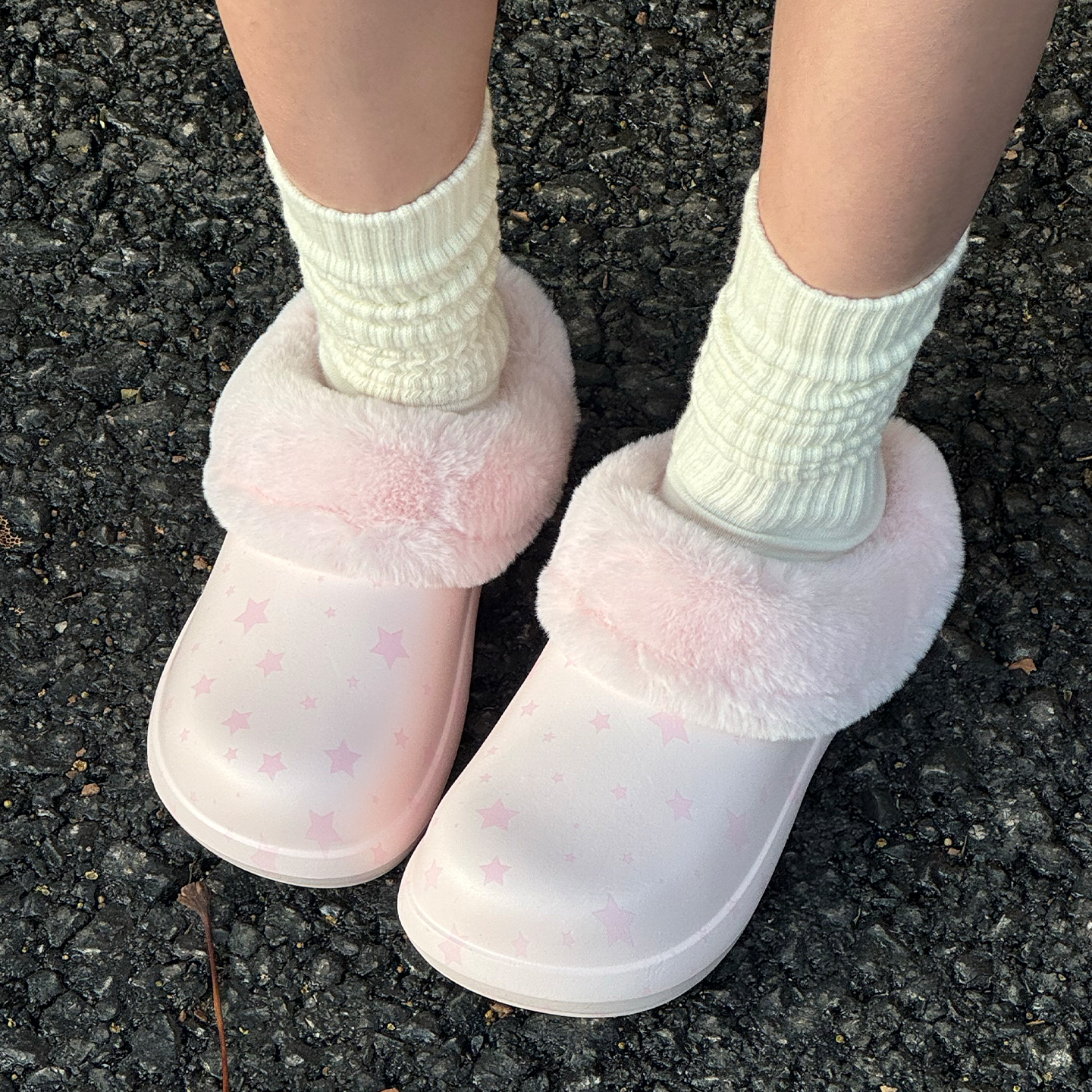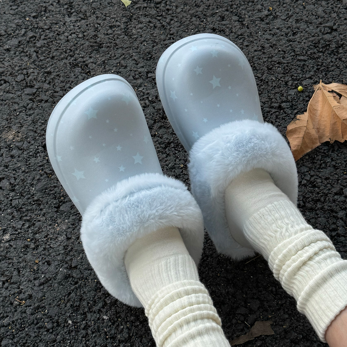 加绒星星厨师鞋女2025冬季新款外穿厚底增高防滑保暖包头毛毛拖鞋