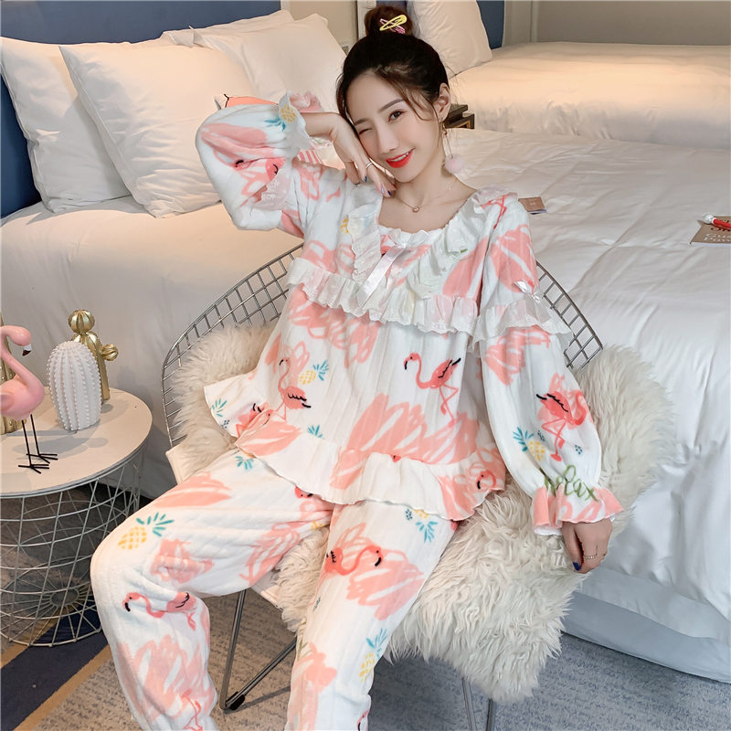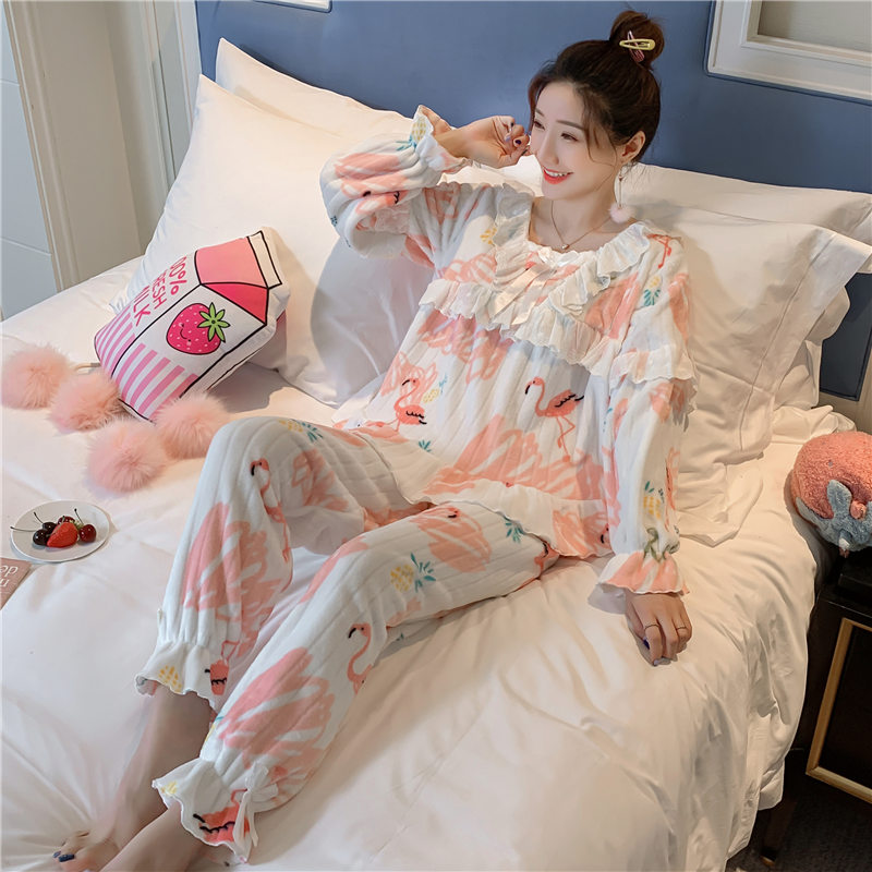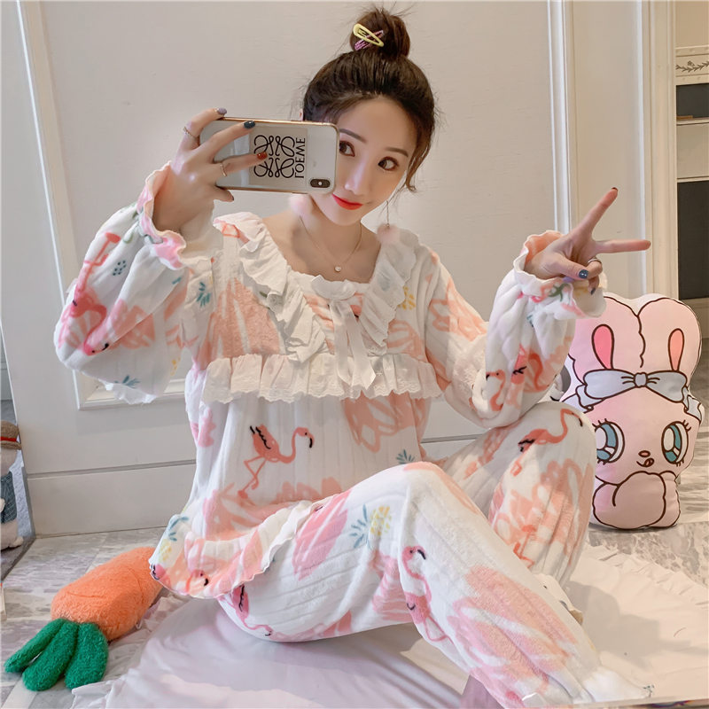 睡衣女秋冬珊瑚绒加厚保暖韩版清新学生甜美家居服套装法兰绒春秋