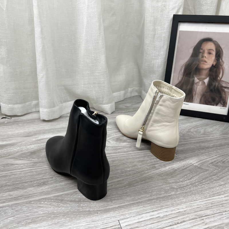 纯色圆头粗跟侧拉链女短靴