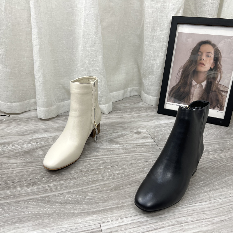 厂家断码处理真皮女靴2023新款粗跟复古纯色圆头侧拉链日常女短靴