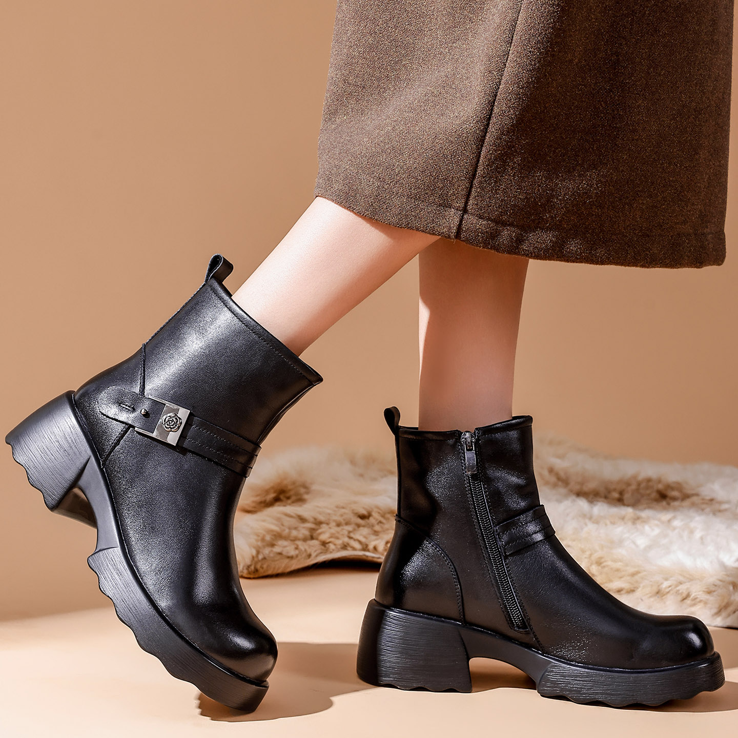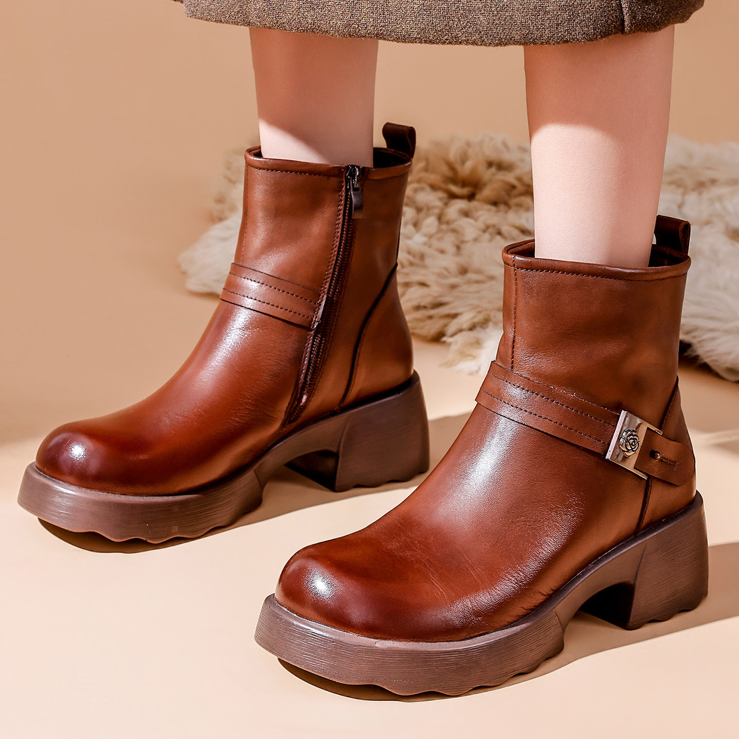 头层牛皮加绒短靴春秋真皮女单靴