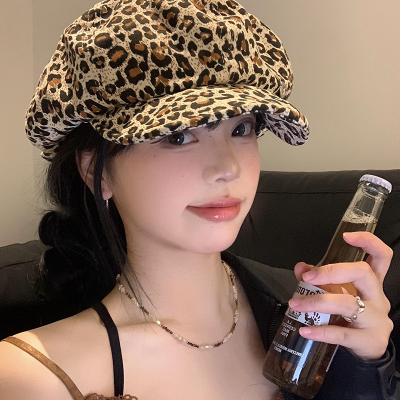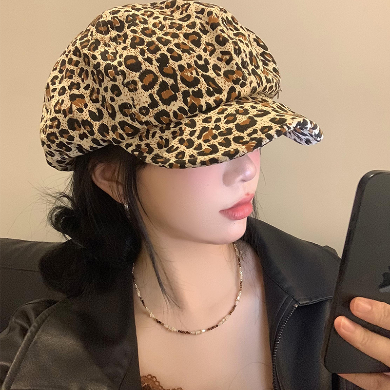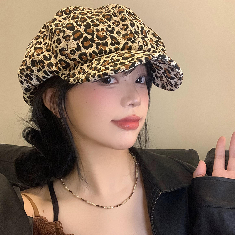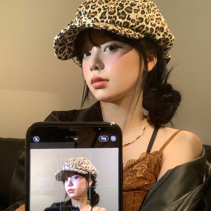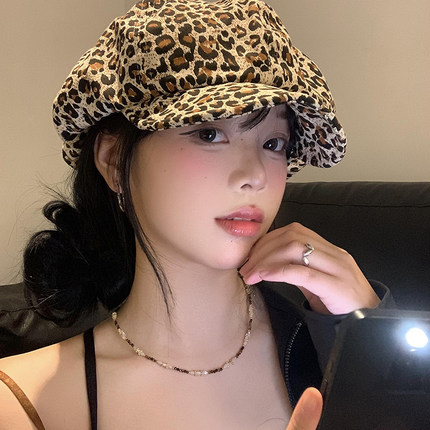 复古辣妹豹纹云朵贝雷帽女百搭显脸小蓓蕾画家帽大头围八角帽子潮