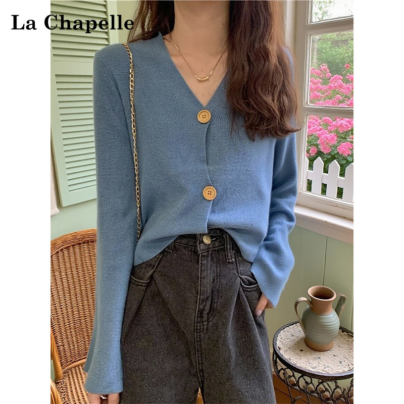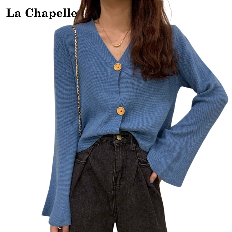 拉夏贝尔蓝色V领喇叭袖针织开衫女秋冬新款内搭毛衣外套长袖上衣