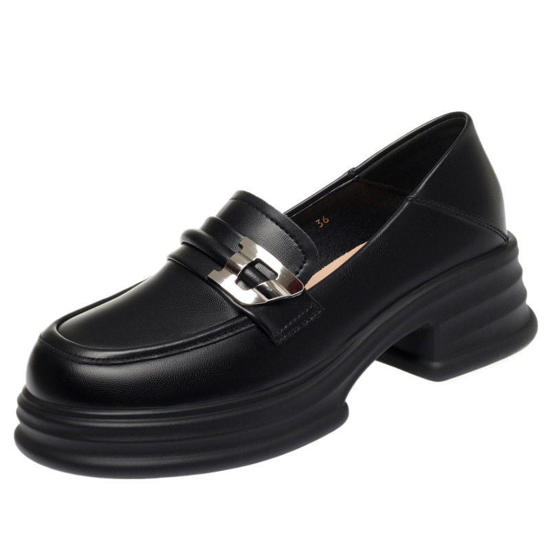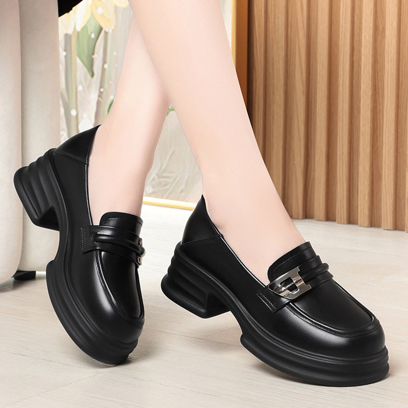 一件代发休闲小皮鞋2025春秋新款女士单鞋粗跟厚底圆头乐福鞋软底