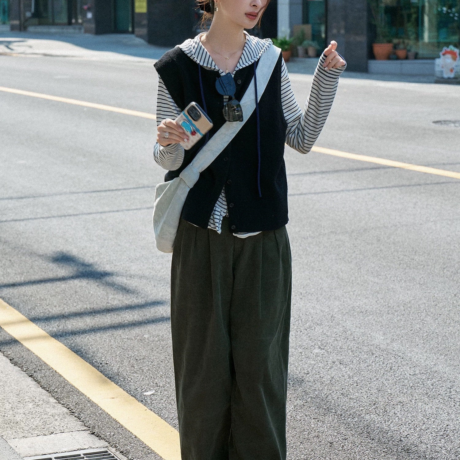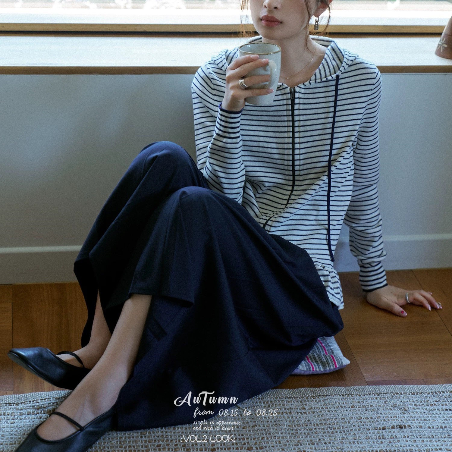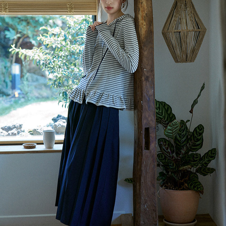 「白描」"奥普琳娜"秋新品条纹卫衣连帽拉链荷叶边针织开衫
