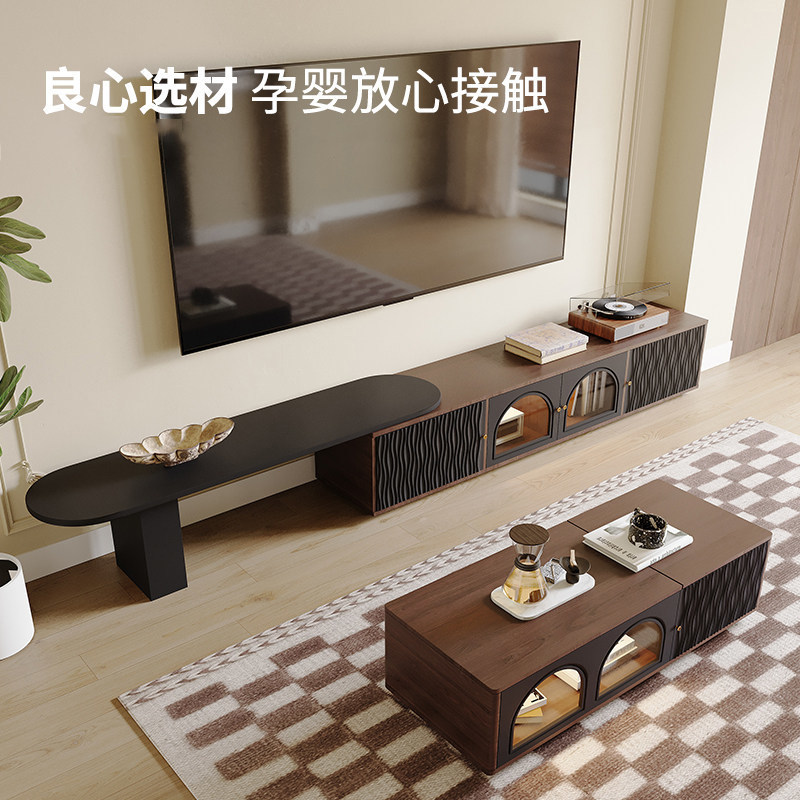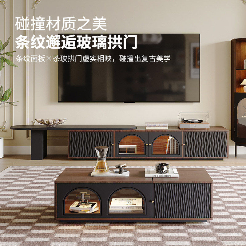 法式复古可伸缩电视柜茶几组合柜2025新款实木中古风电视机边柜