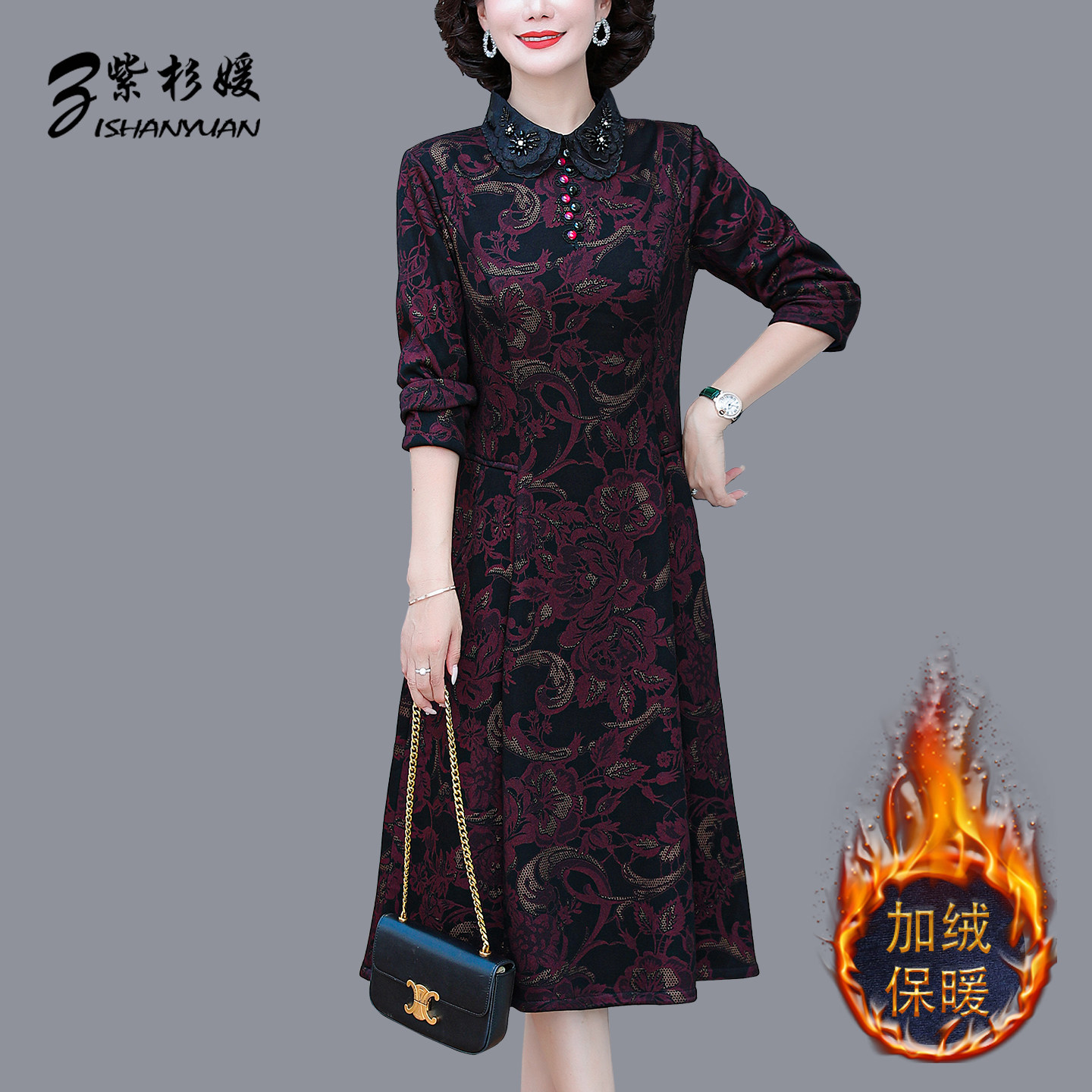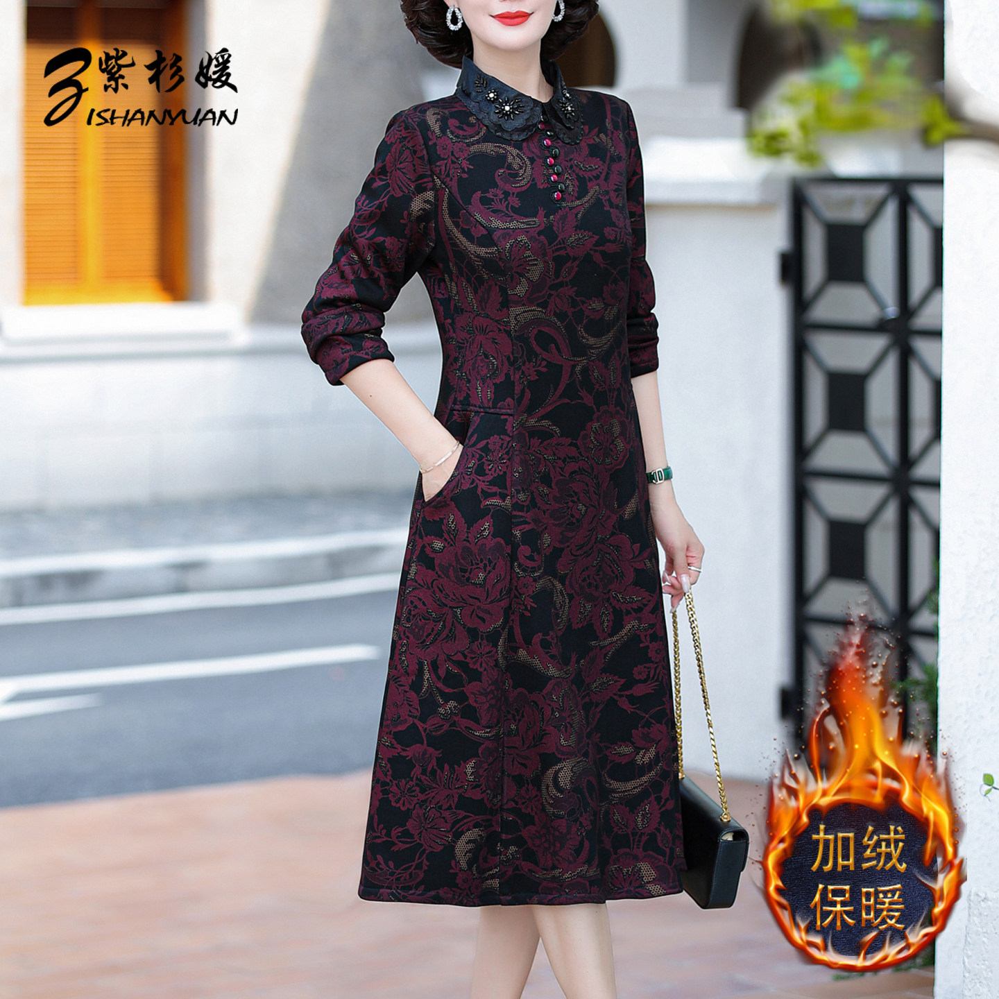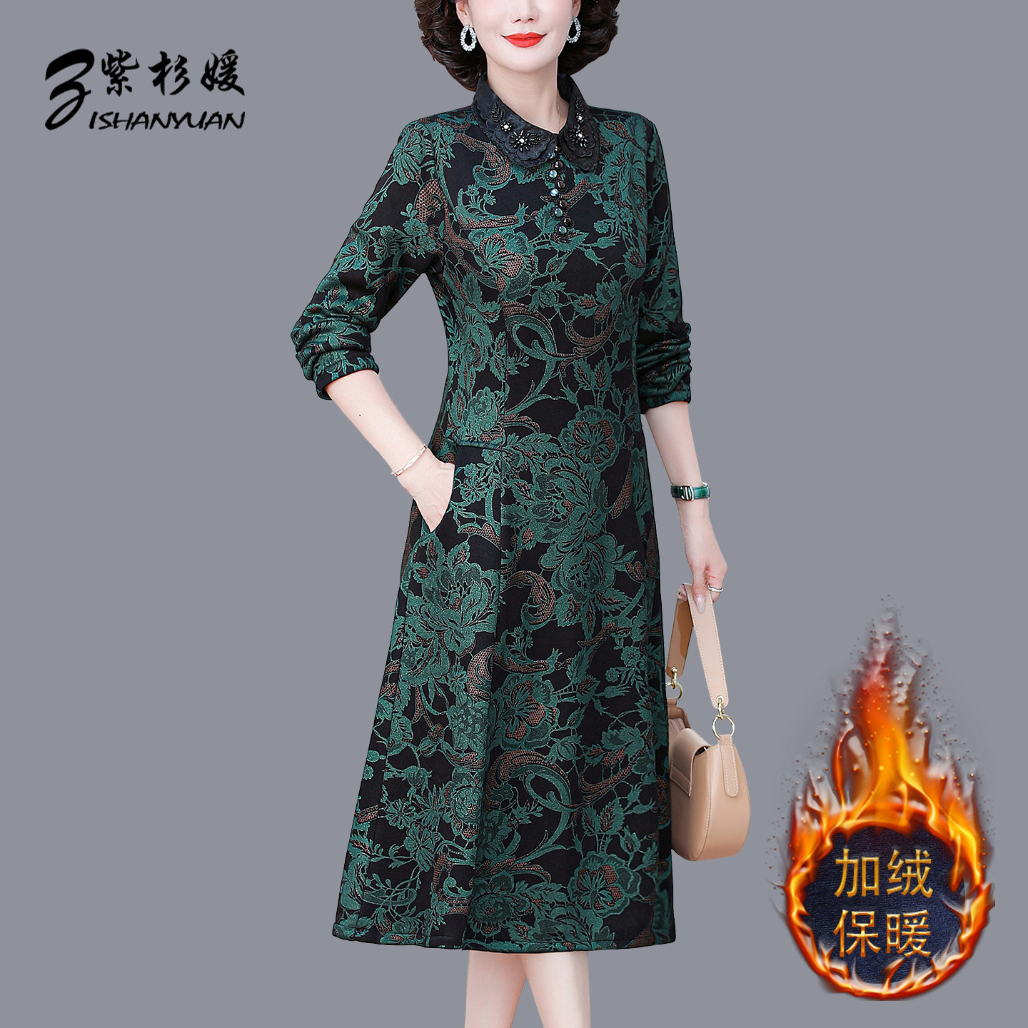 秋冬加绒加厚保暖打底裙中老年女装气质妈妈遮肉显瘦连衣裙中长款