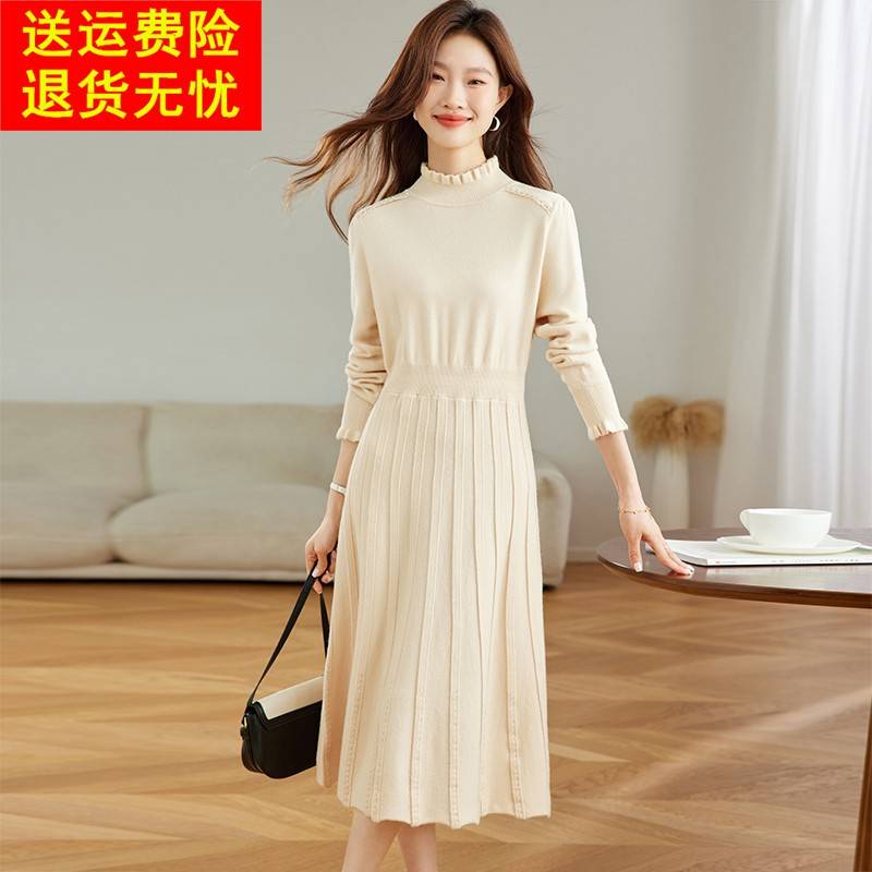 木耳领羊绒针织连衣裙女秋冬2024新款配大衣内搭中长款打底毛衣裙