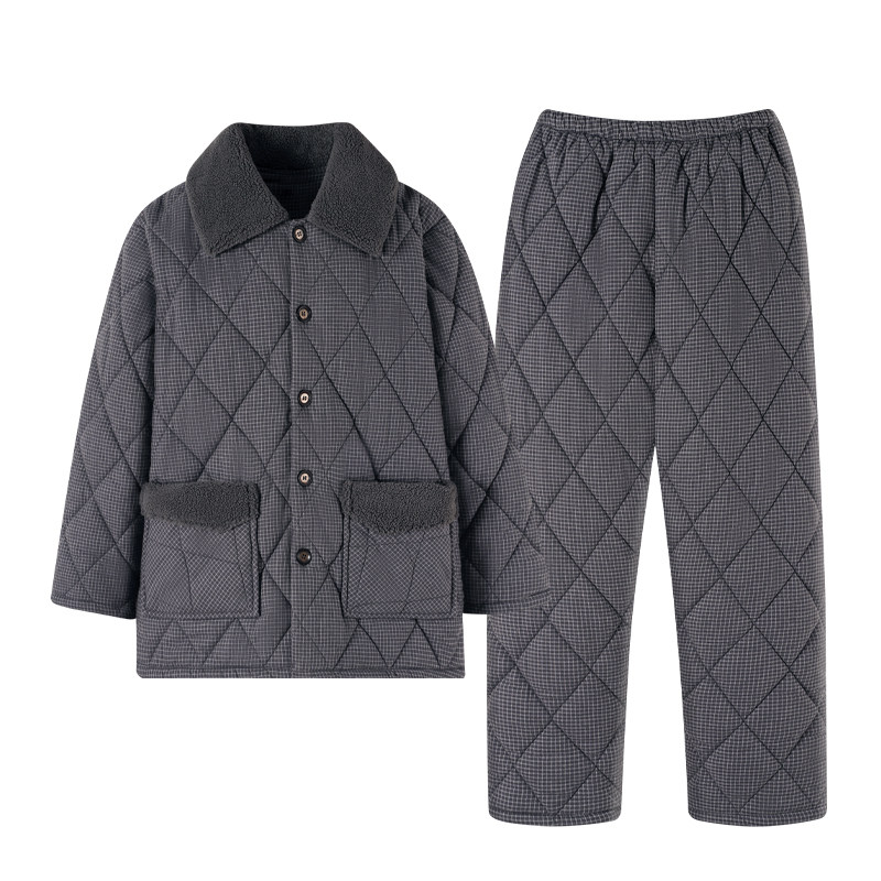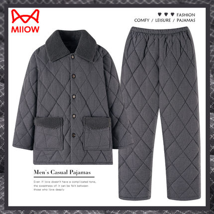 猫人男士三层夹棉睡衣秋冬款加厚加绒梭织纯棉保暖家居服套装