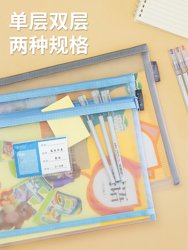 高尚马卡龙色学科科目分类袋A4手提文件袋大容量双层拉链作业袋小学生用网纱资料袋分科书袋子试卷课本补习袋