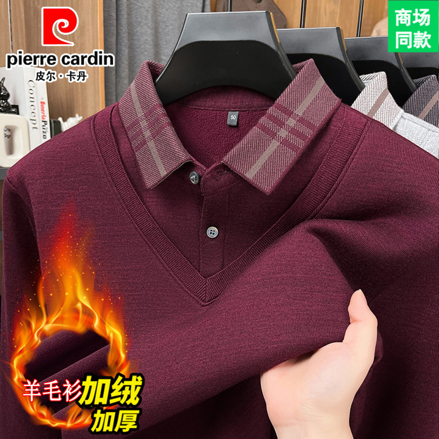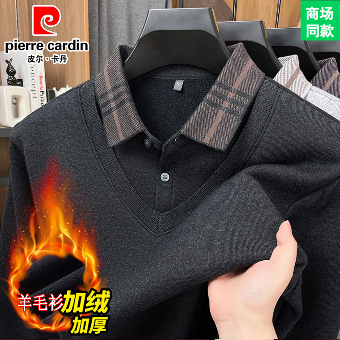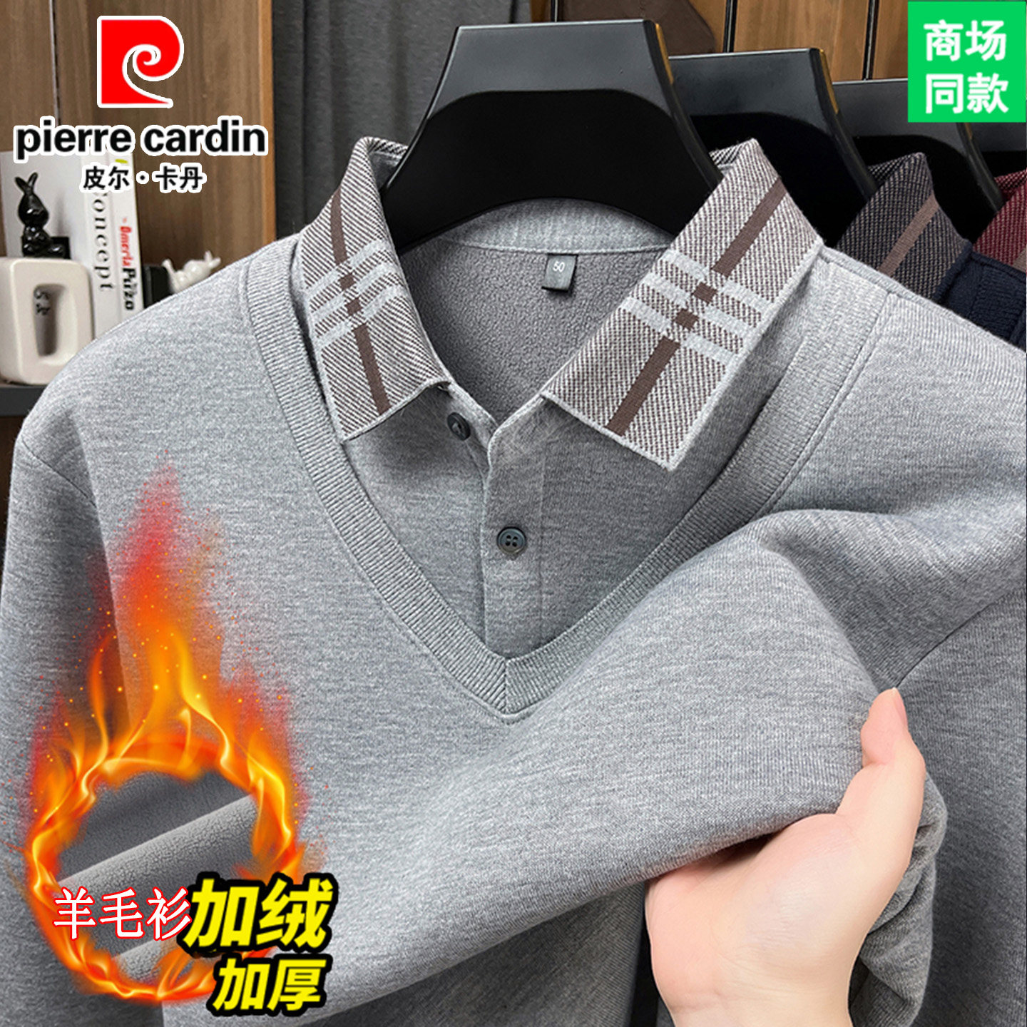 皮尔卡丹男士加绒加厚羊毛衫新款假两件毛衣针织衫纯色保暖打底衫
