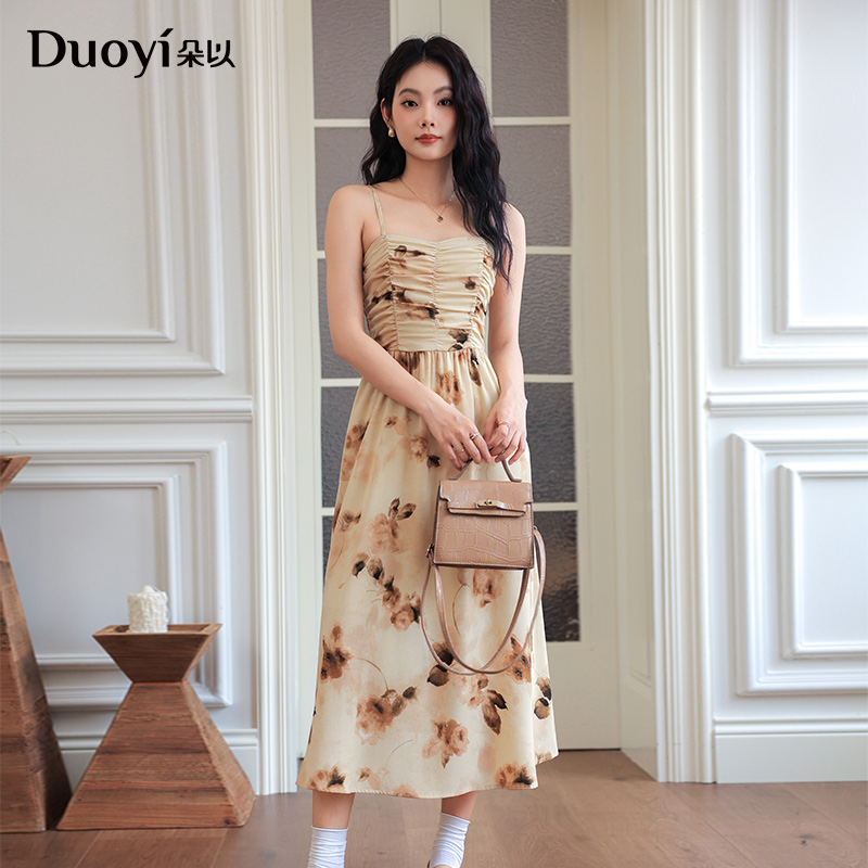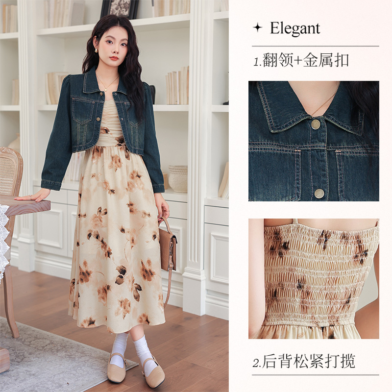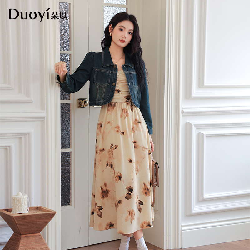 朵以2025秋季新款复古牛仔短外套打揽修身印花吊带裙长裙法式套装