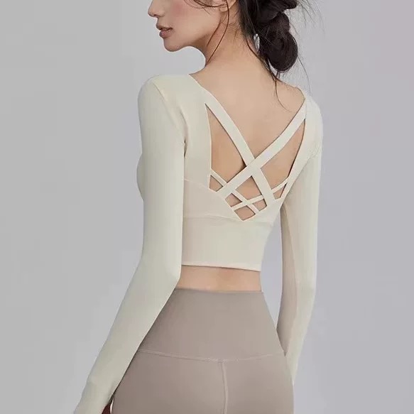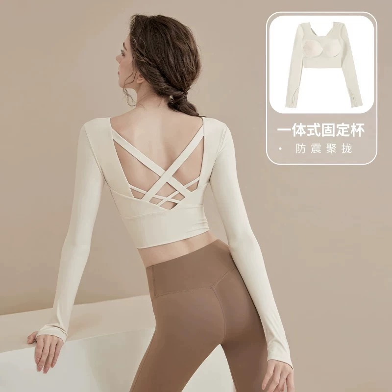2025新款瑜伽服套装春秋长袖固定杯垫健身普拉提运动上衣训练T恤