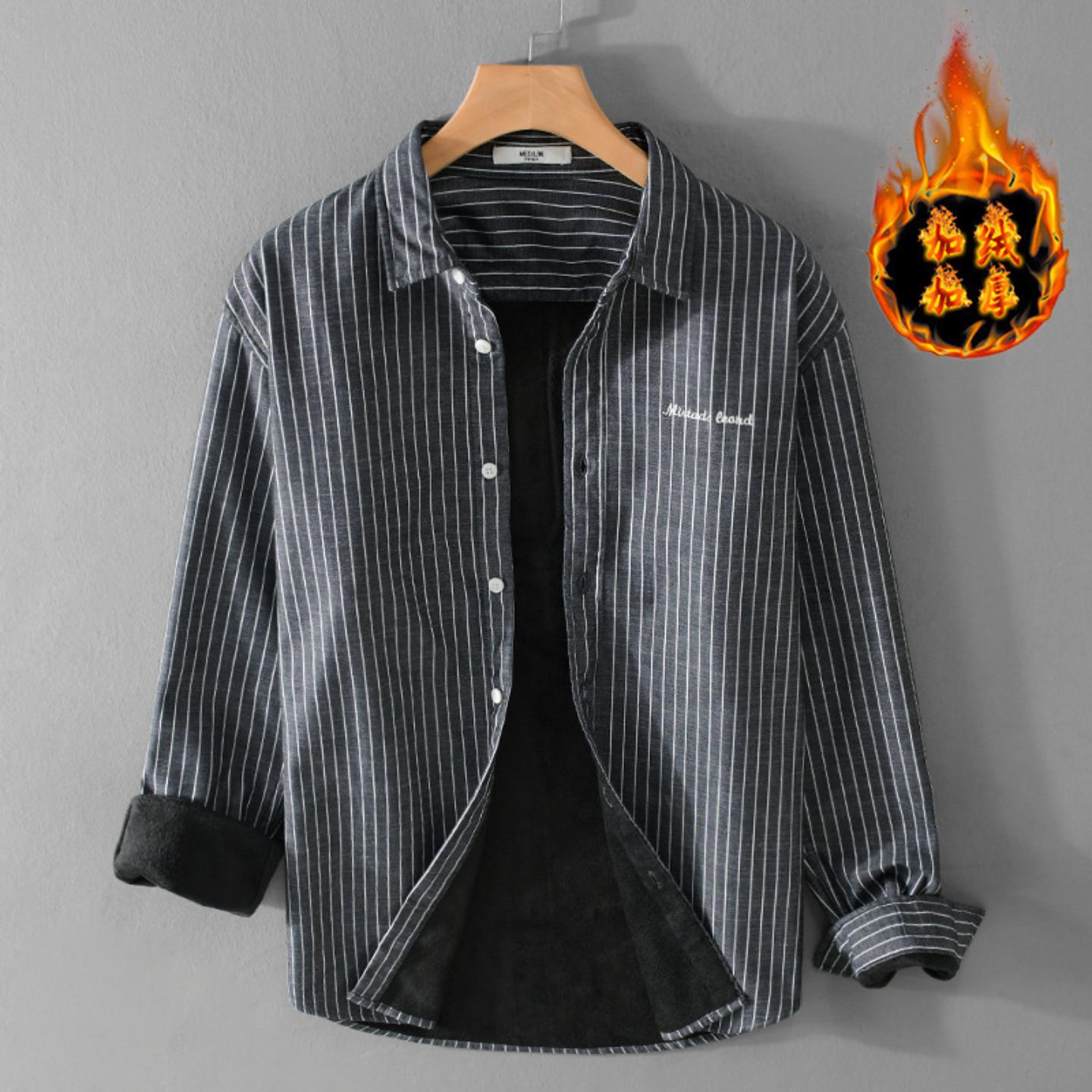 加绒加厚男装休闲冬季保暖衬衫时尚潮男条纹百搭文艺男上衣9430