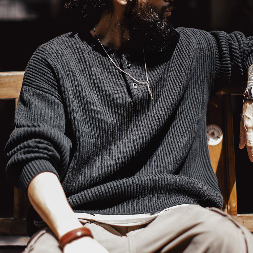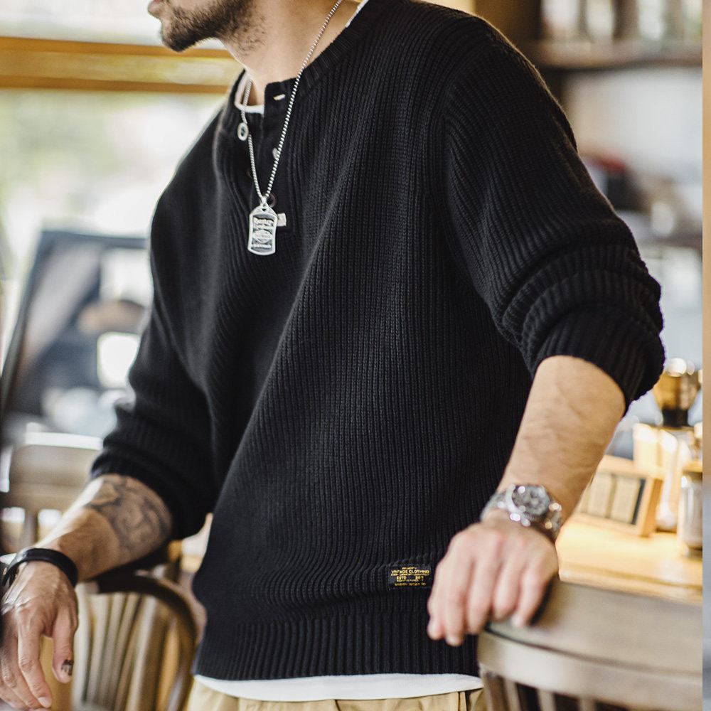 马登工装美式复古黑色针织亨利衫