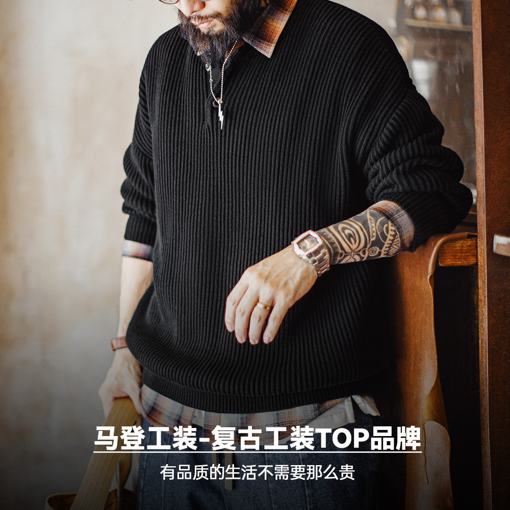 马登工装美式复古竖条纹亨利领毛衣宽松加厚黑色打底针织衫男秋冬