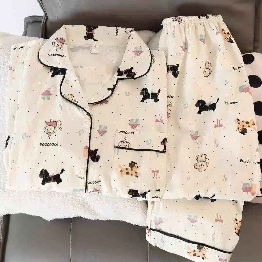 彩色波点睡衣女长袖长裤春秋款纯棉纱布套装休闲开衫家居服夏冬季