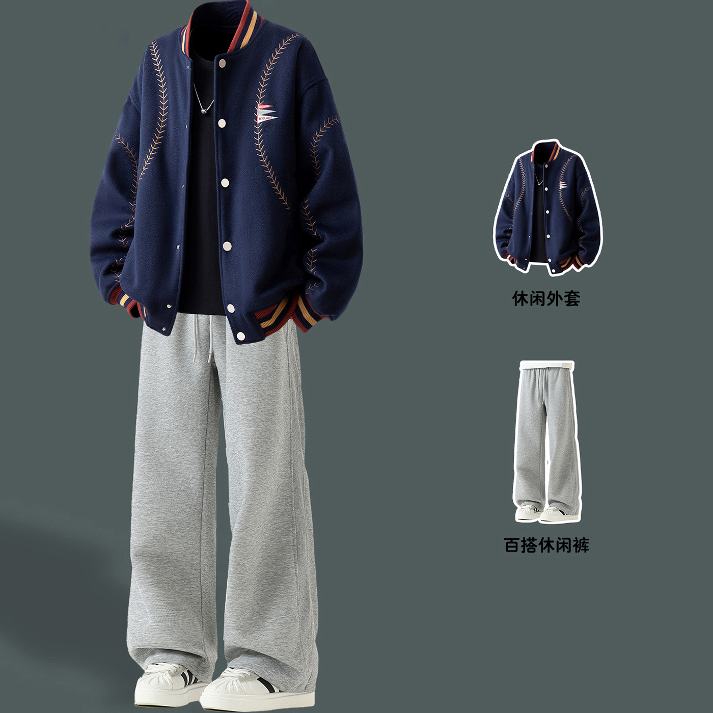 美式刺绣夹克男士秋冬毛呢棒球服运动外套休闲套装新款潮牌一整套