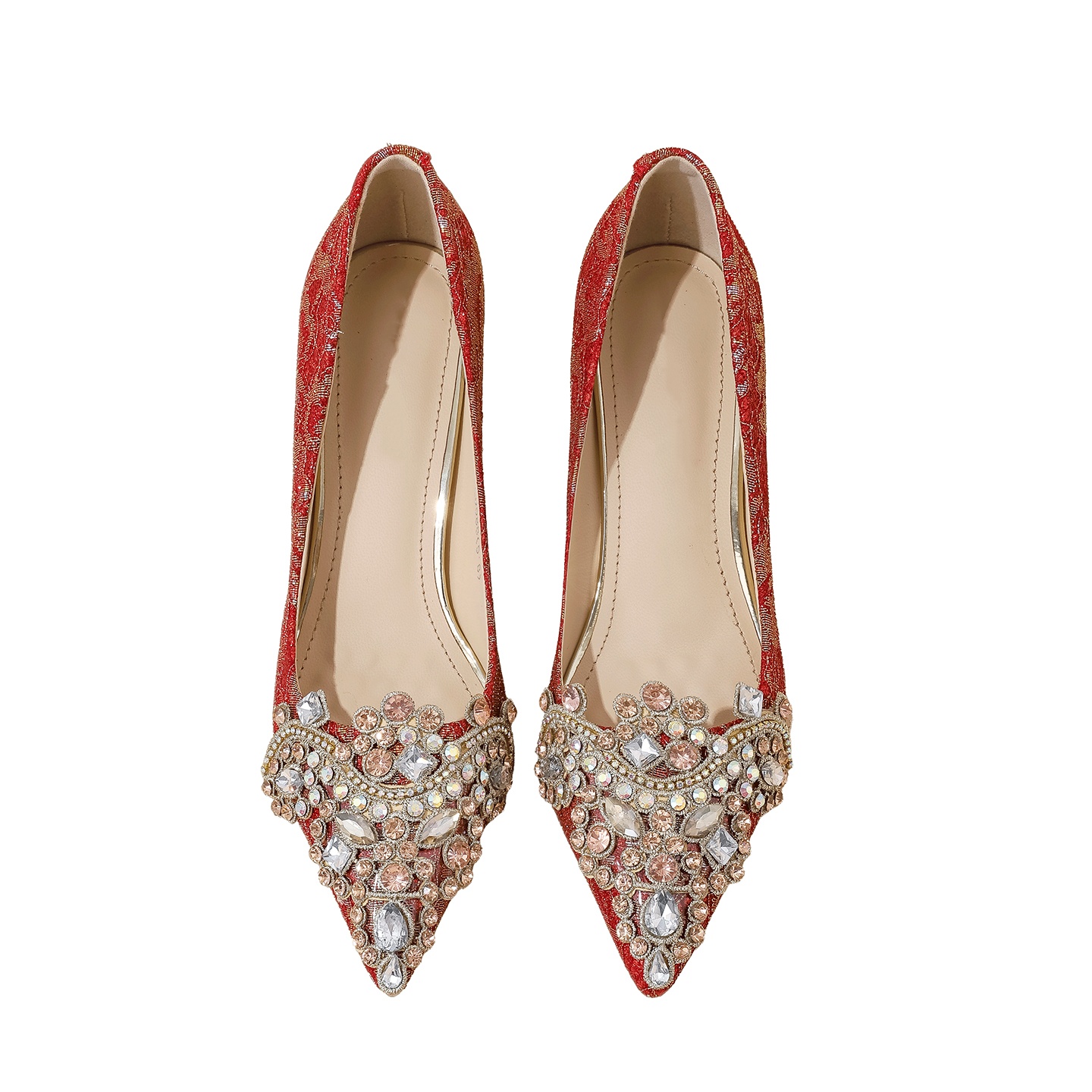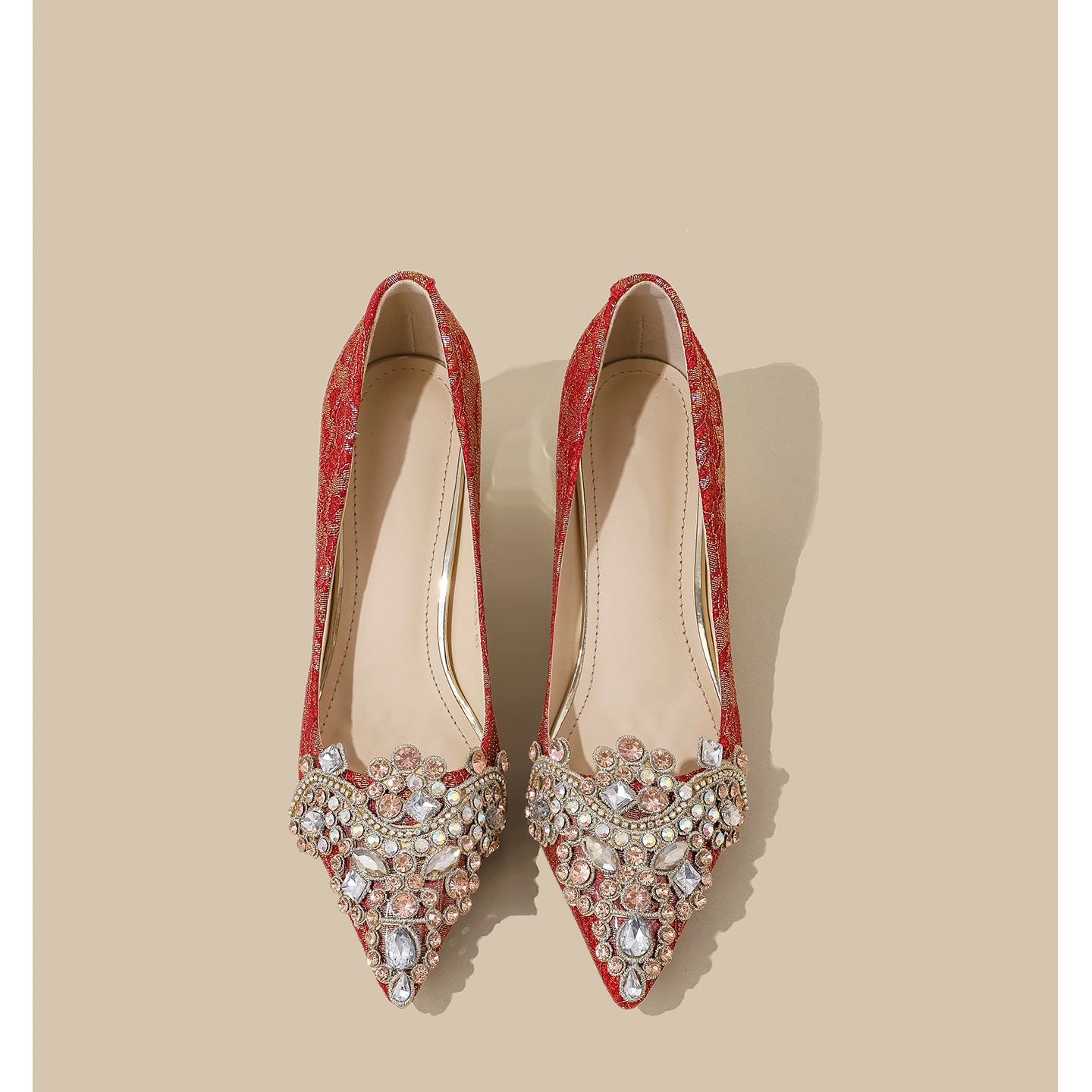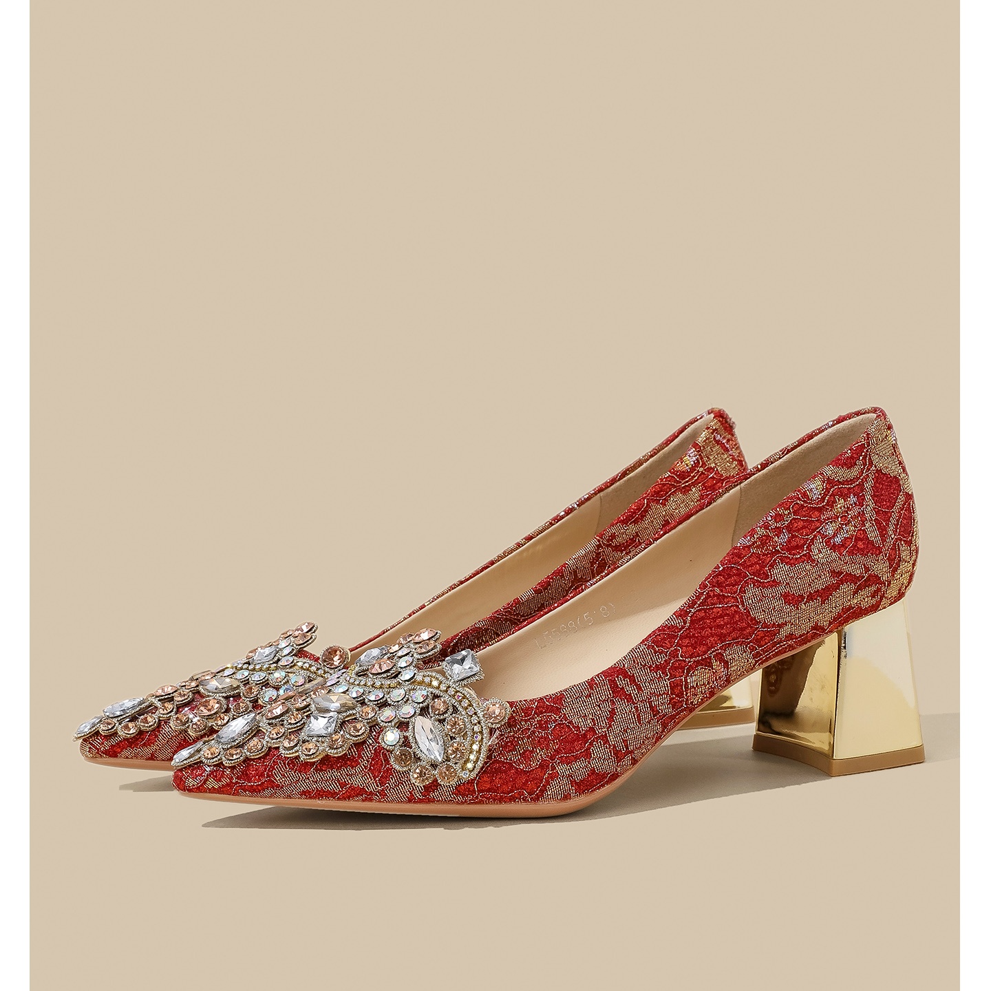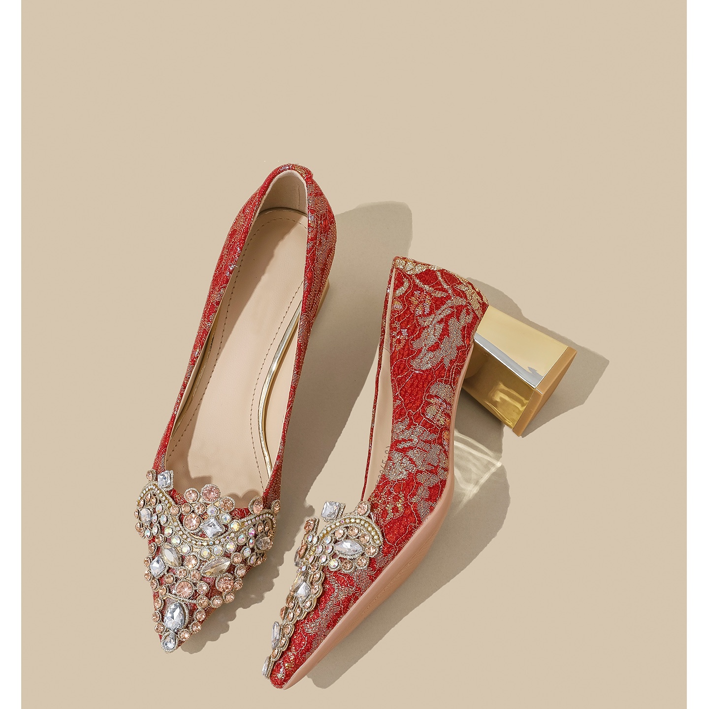 小众高级感红色水钻婚鞋女秀禾服绝美中式新娘鞋粗跟尖头敬酒单鞋