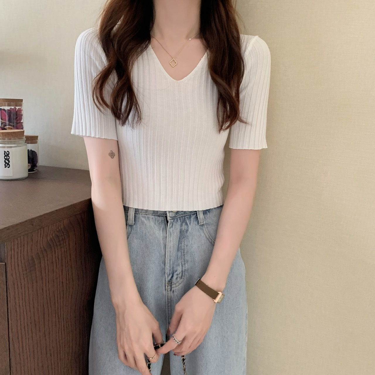 夏季韩版薄款冰丝针织V领坑条设计时尚洋气修身百搭短袖短款潮女