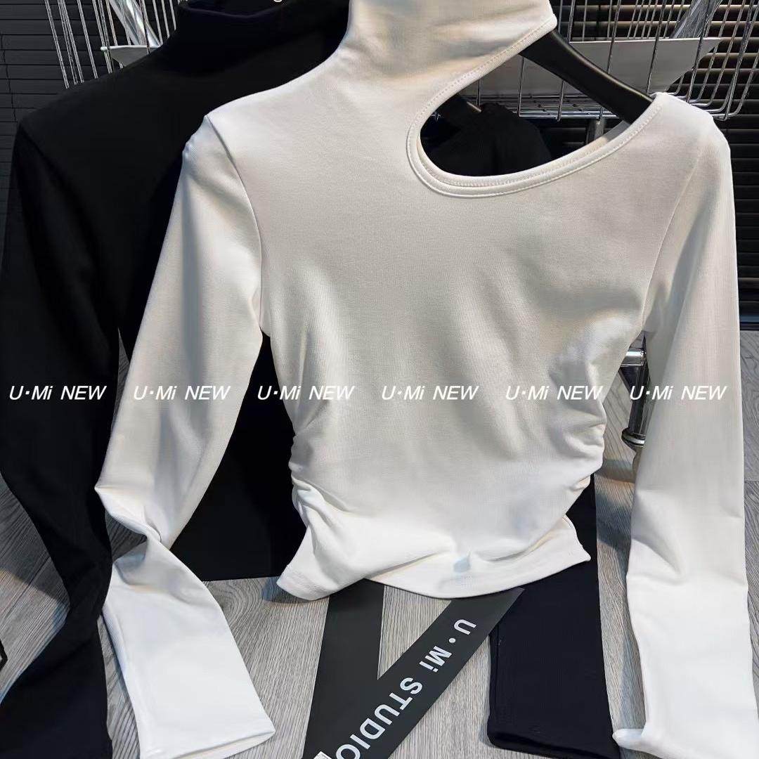 2025秋季新款小心机纯欲短款辣妹长袖上衣磨毛绒镂空半高领T恤女