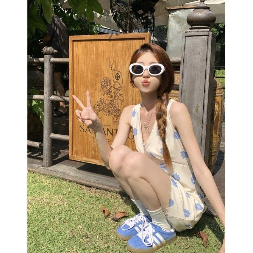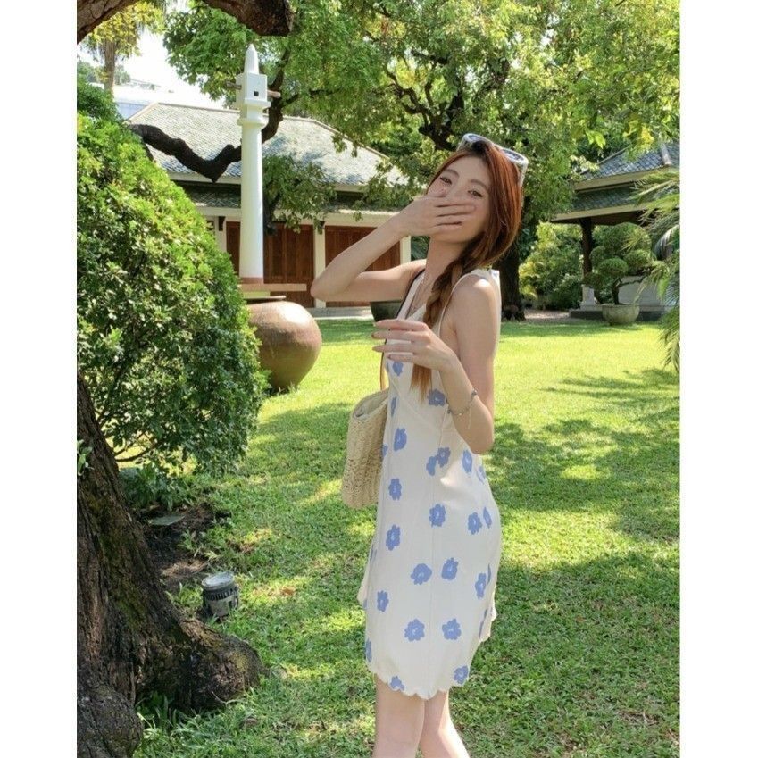 2025夏季新款韩系温柔风撞色花朵V领无袖连衣裙女高腰背心短裙