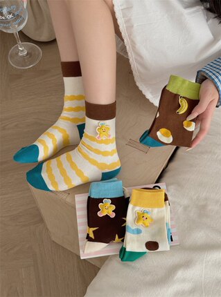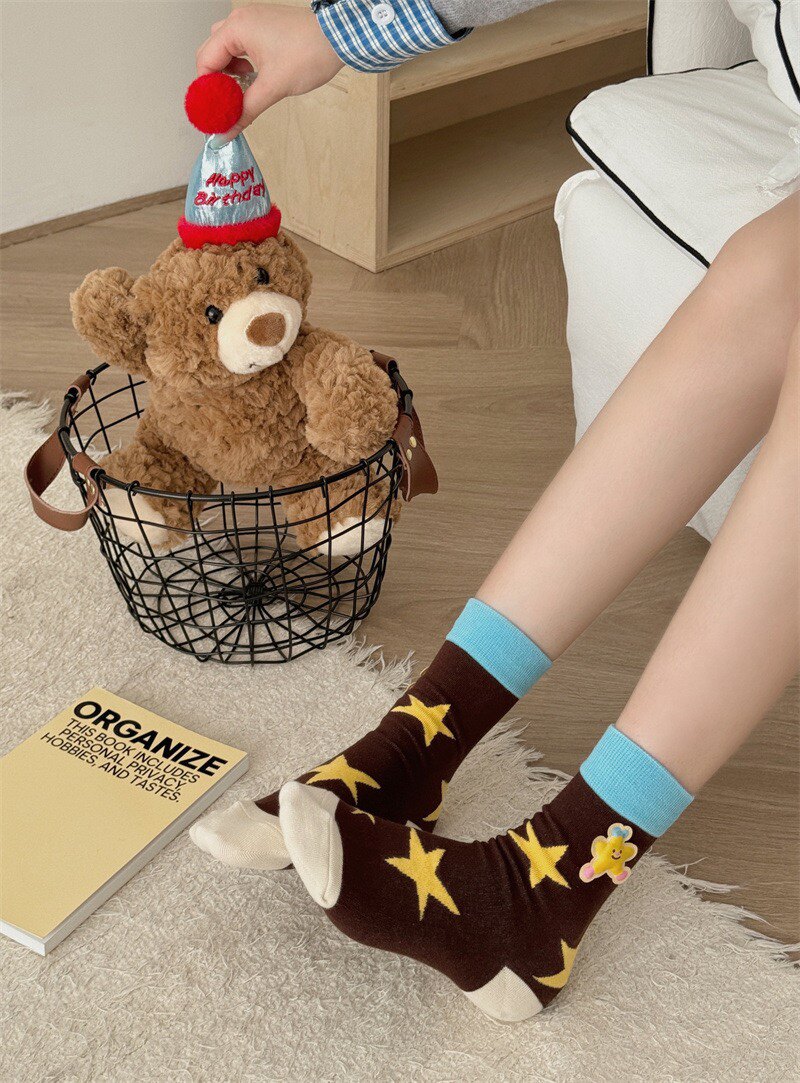 秋冬纯棉潮款高筒女士卡通长袜子立体装饰柔软星星百搭神器socks