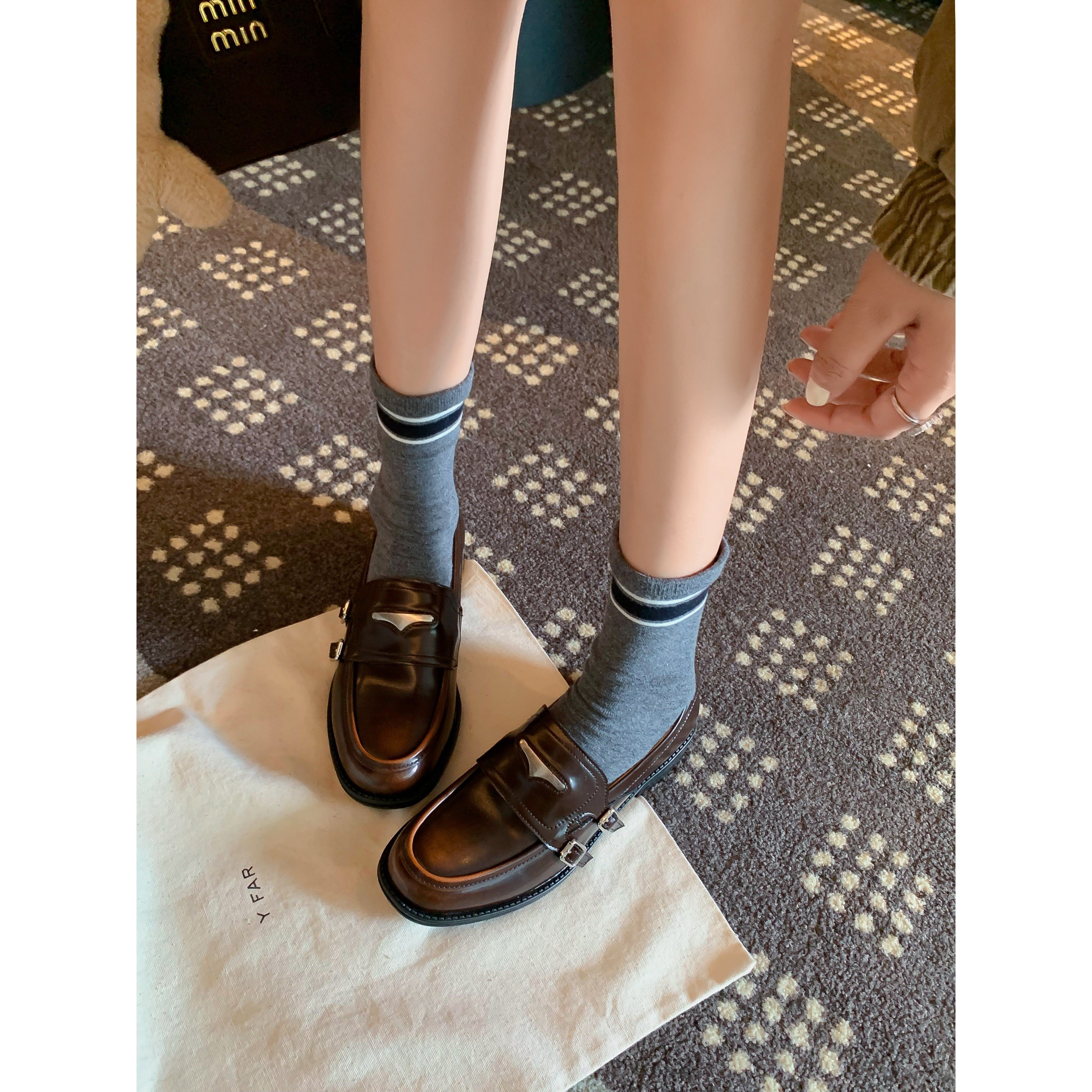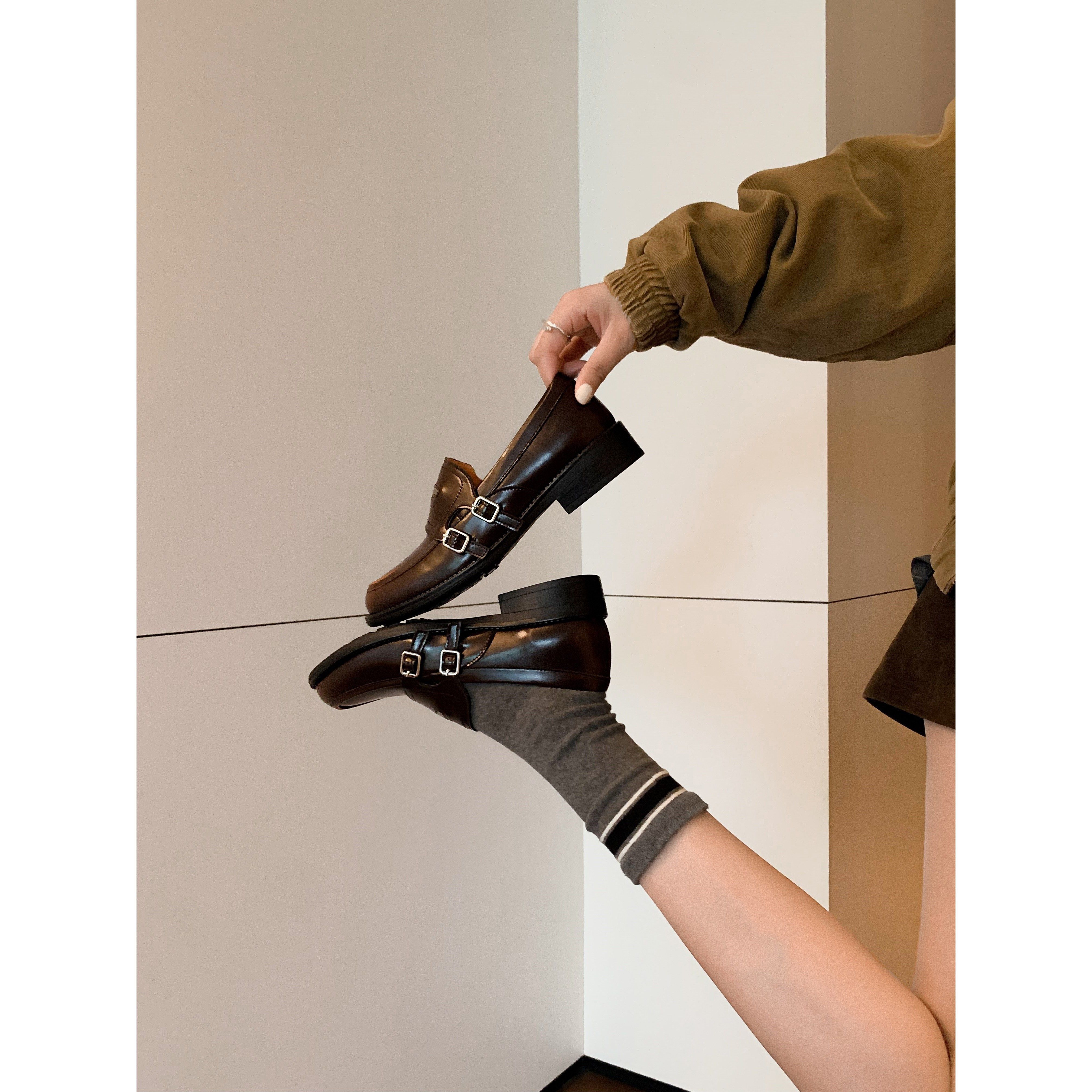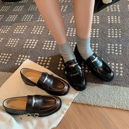 2026春季复古加绒粗跟乐福鞋女金