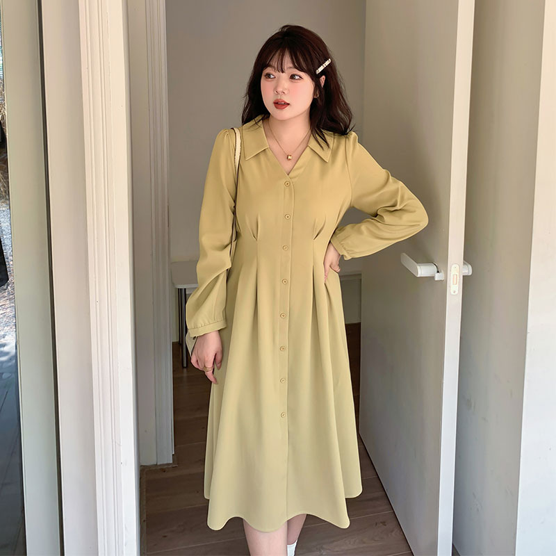 衬衫连衣裙2025春季新款220斤胖mm加大码V领显瘦捏褶收腰a字长裙