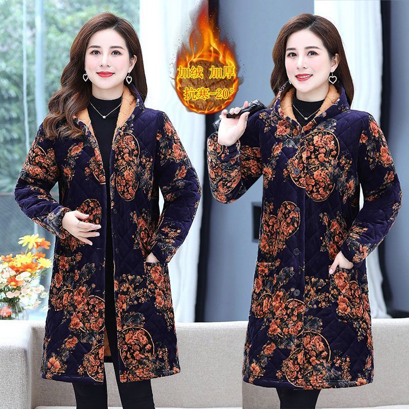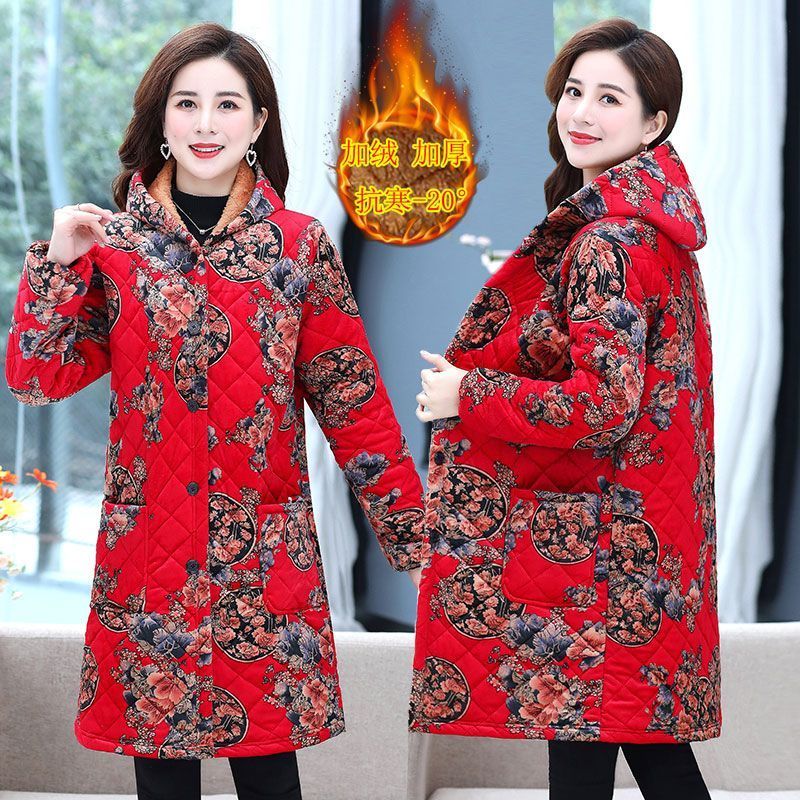 四川省服妈妈冬季新款印花棉大衣中年女士连帽加绒加厚棉衣外套