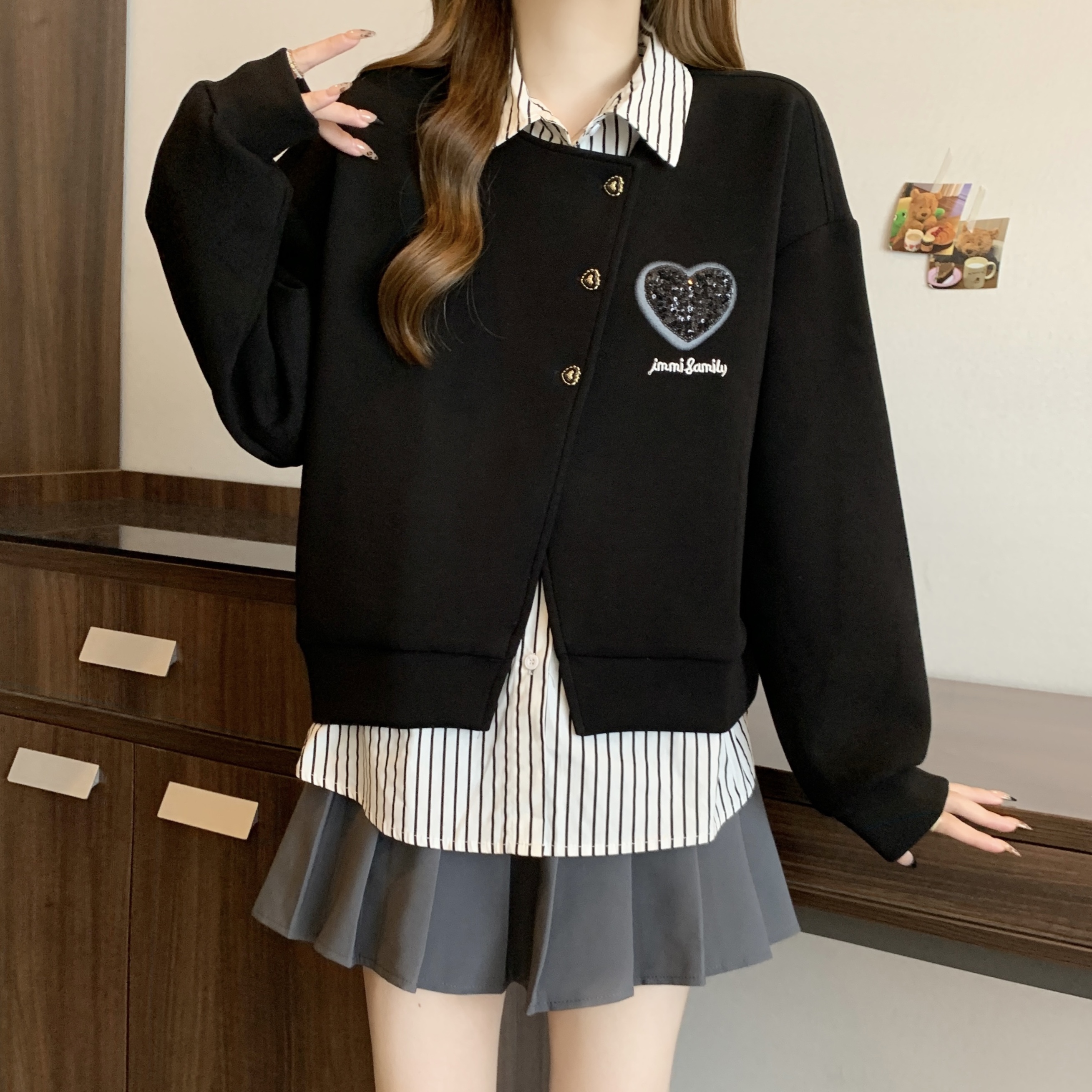 大码2024秋季新款条纹拼接衬衫卫衣女假两件松弛感穿搭宽松上衣