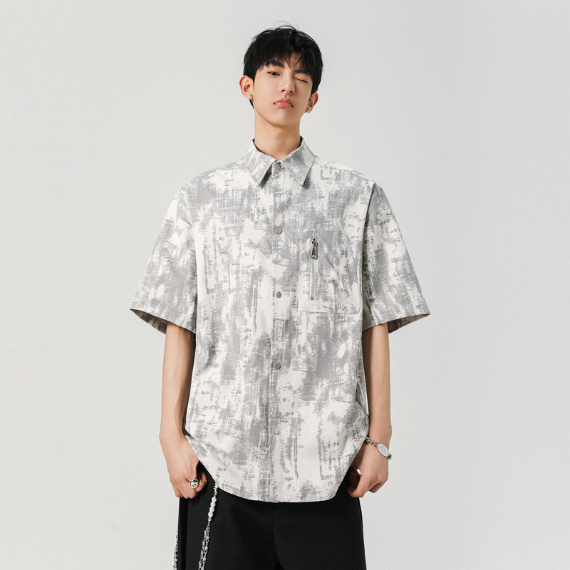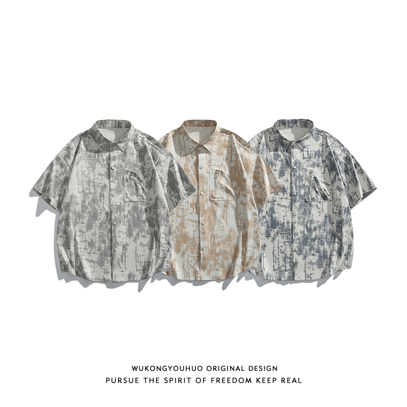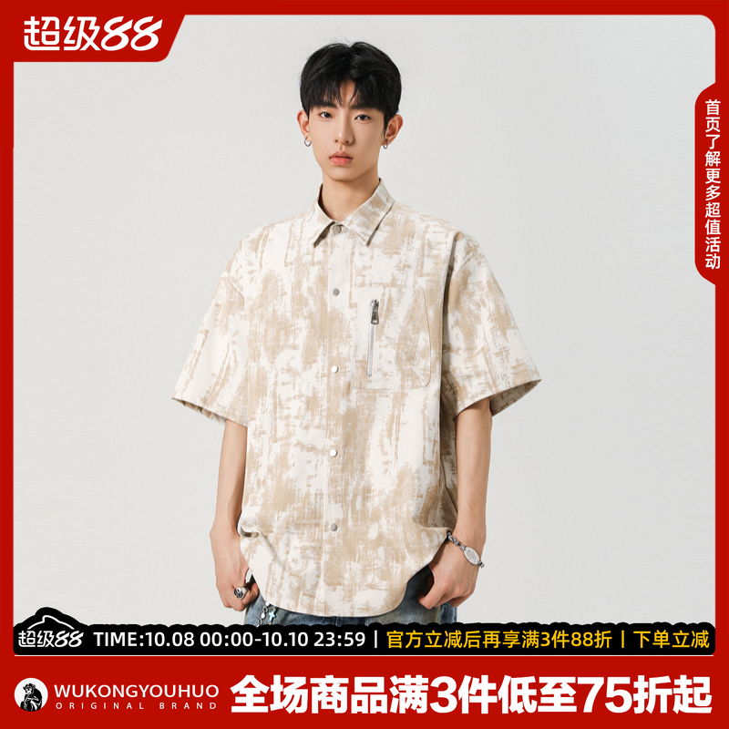 悟空有货夏季复古扎染渐变短袖衬衫男女潮牌宽松情侣休闲百搭衬衣