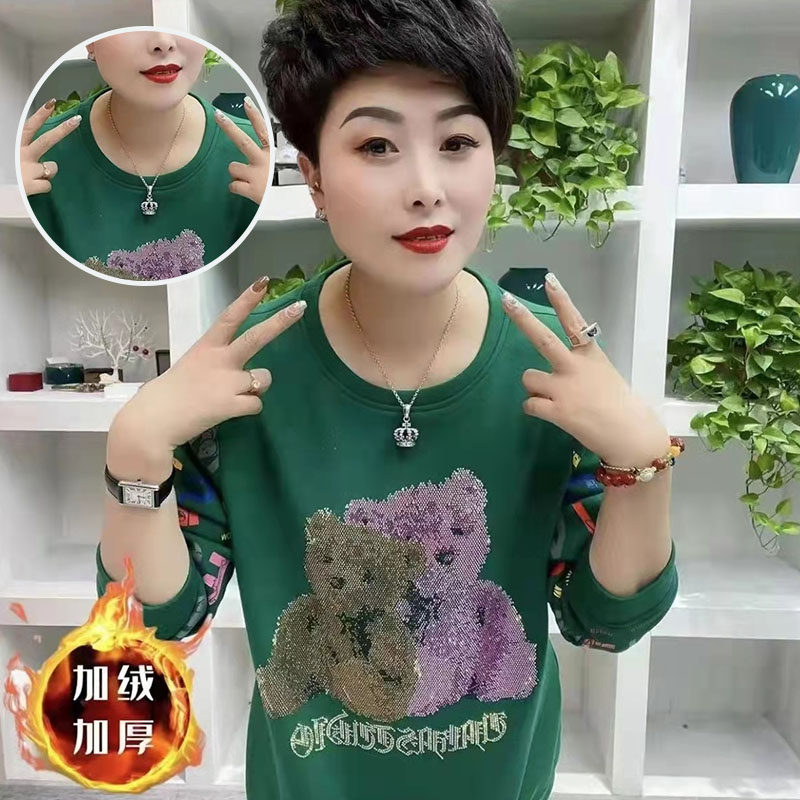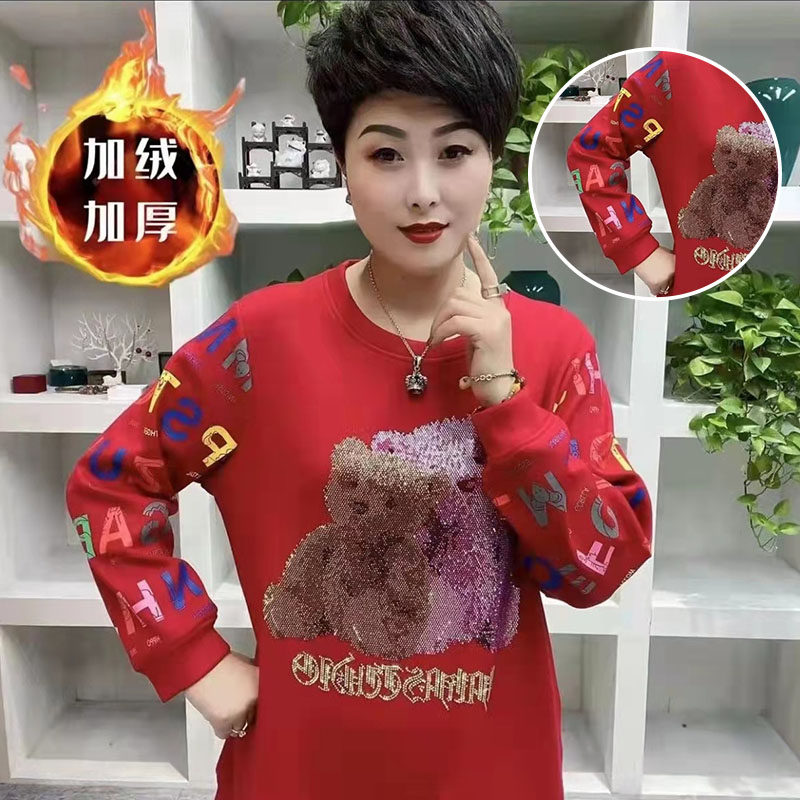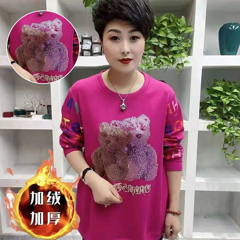 卫衣女加绒加厚冬黑色2024特大码套头圆领宽松时尚显瘦小熊烫钻潮