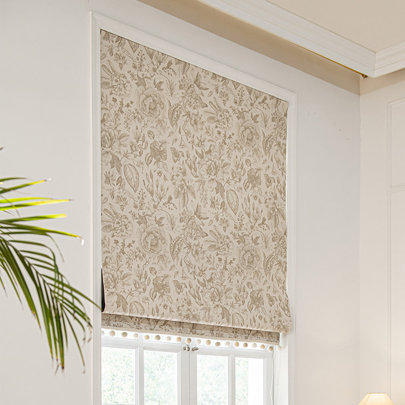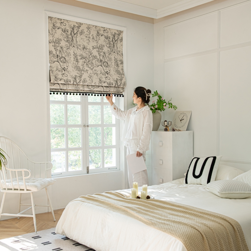 定制卧室客厅书房飘窗提拉升降帘布卷帘遮光法式花边毛球罗马窗帘