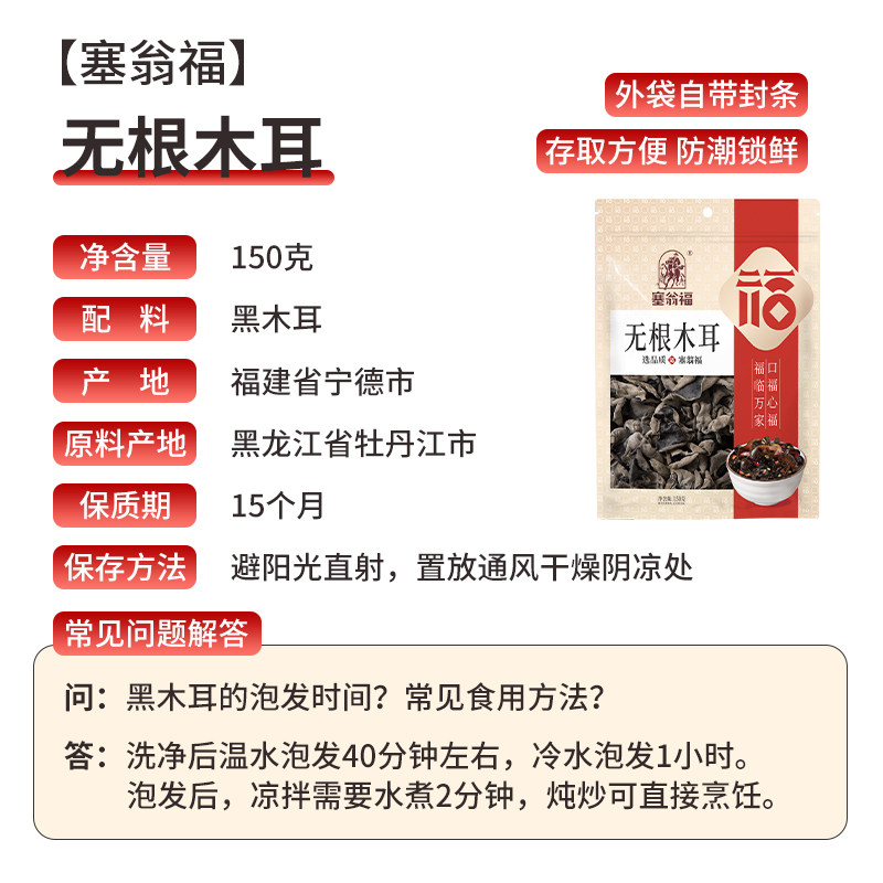 塞翁福黑木耳无根木耳150g东北黑木耳干货食材黑龙江