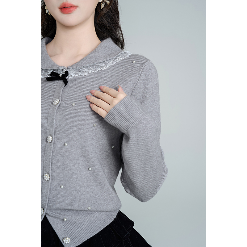 法式甜美灰色娃娃领短款开衫毛衣女冬季小香风钉珠拼接蕾丝针织衫