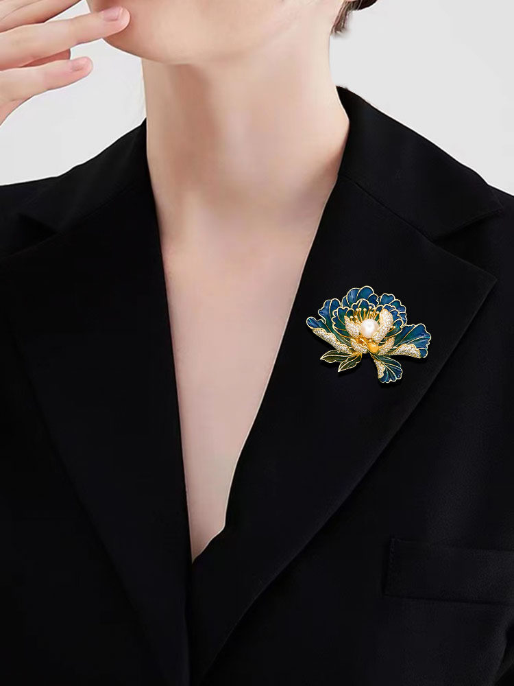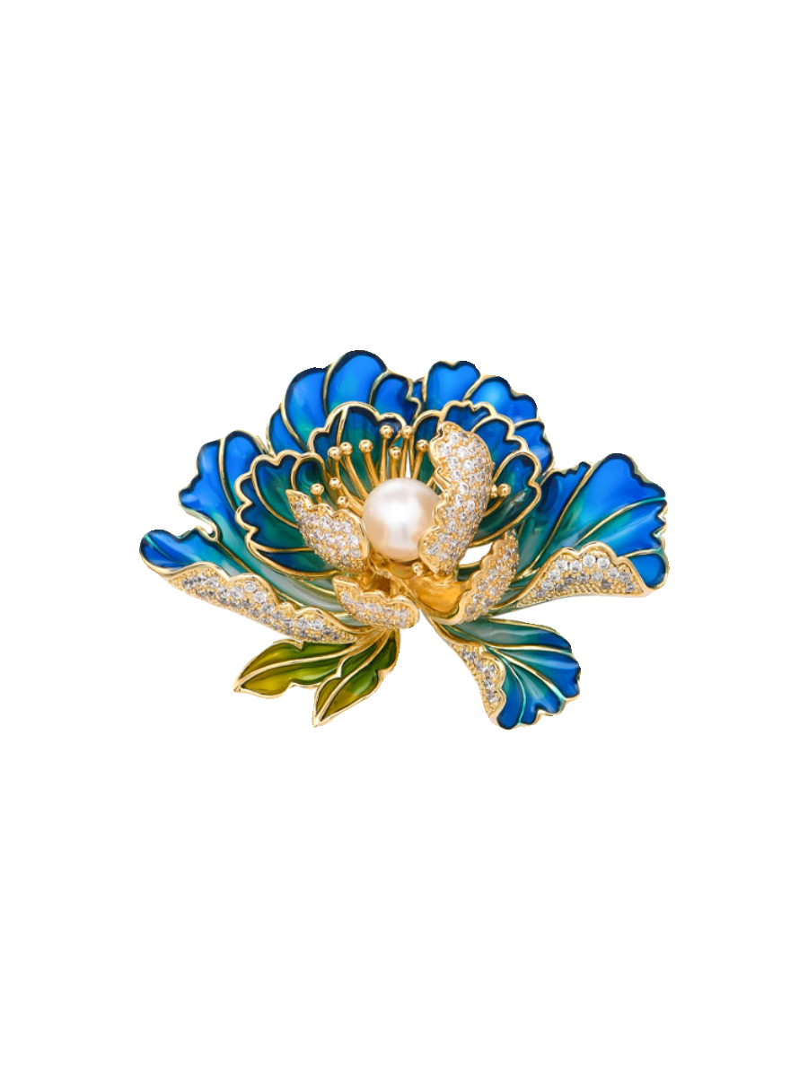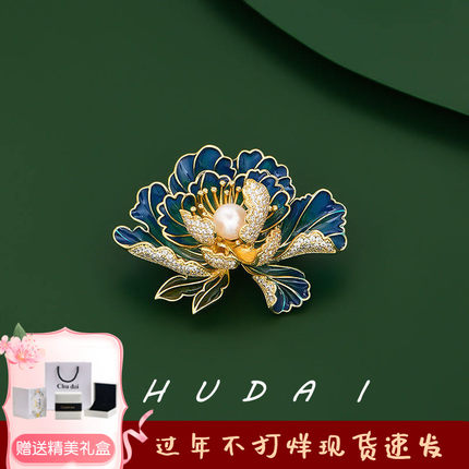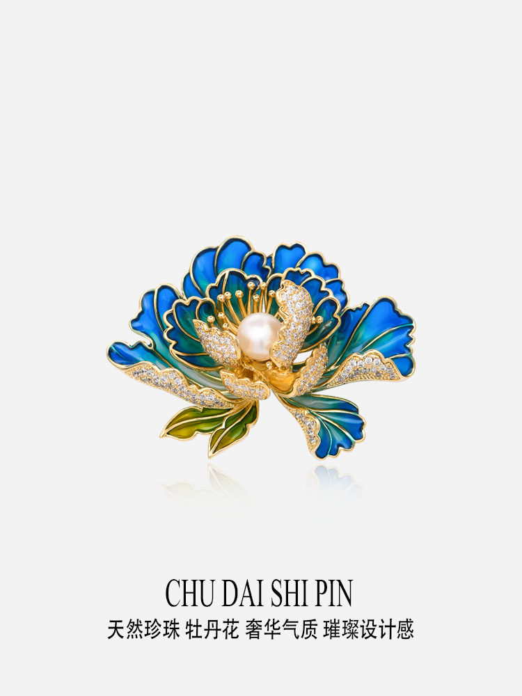 古典景泰蓝花开富贵胸针高档女天然淡水珍珠气质西装别针奢华大气