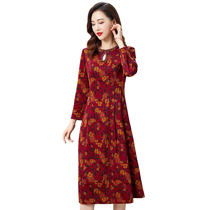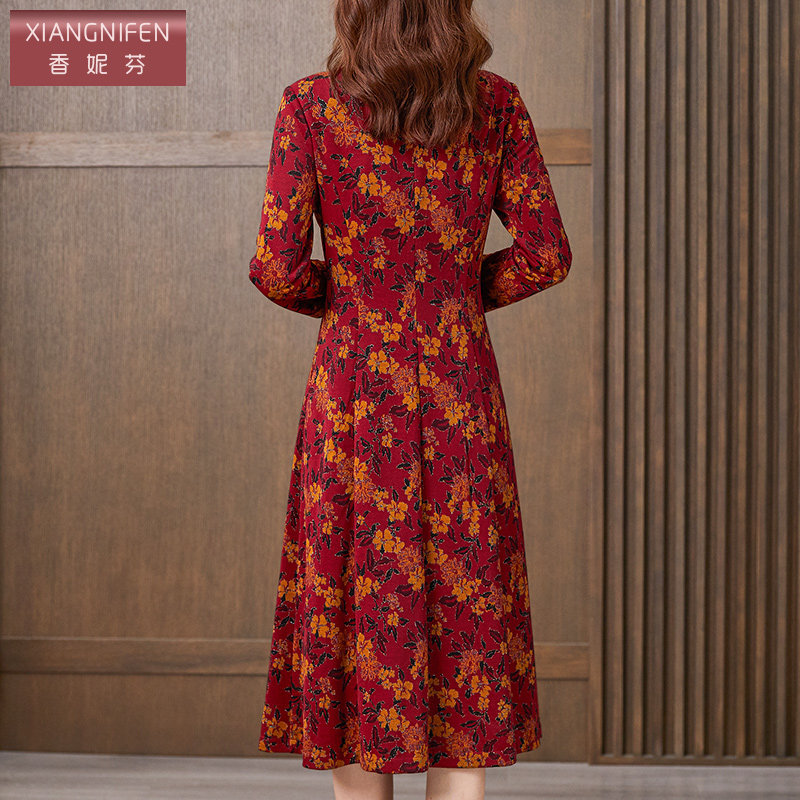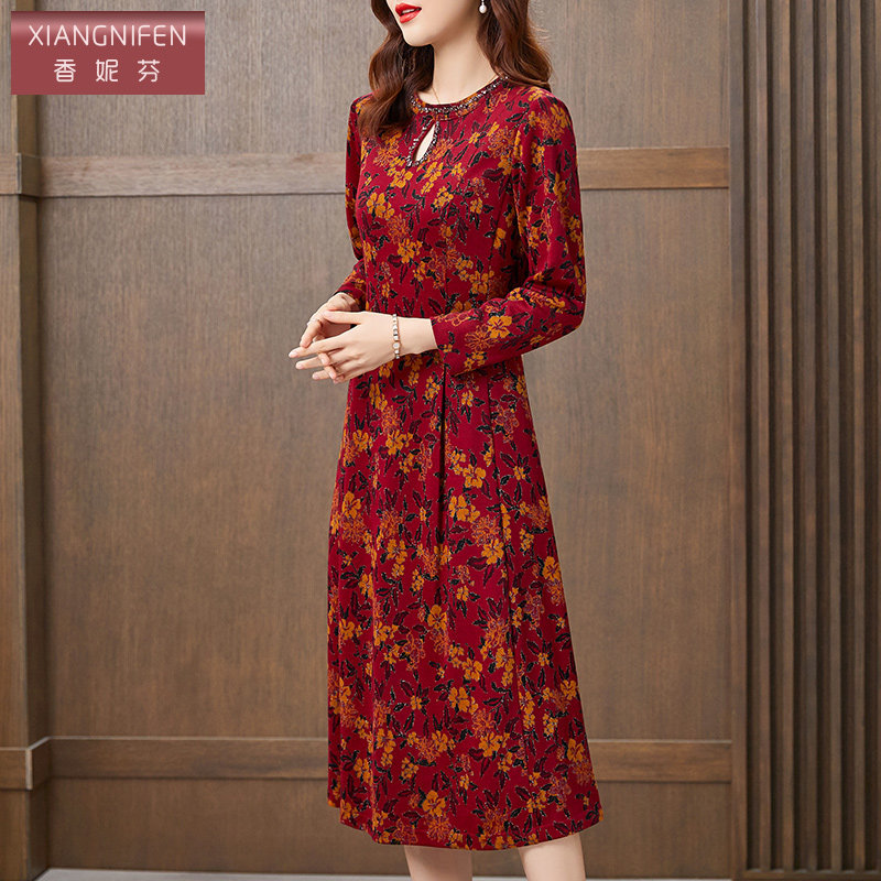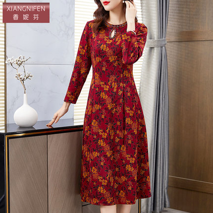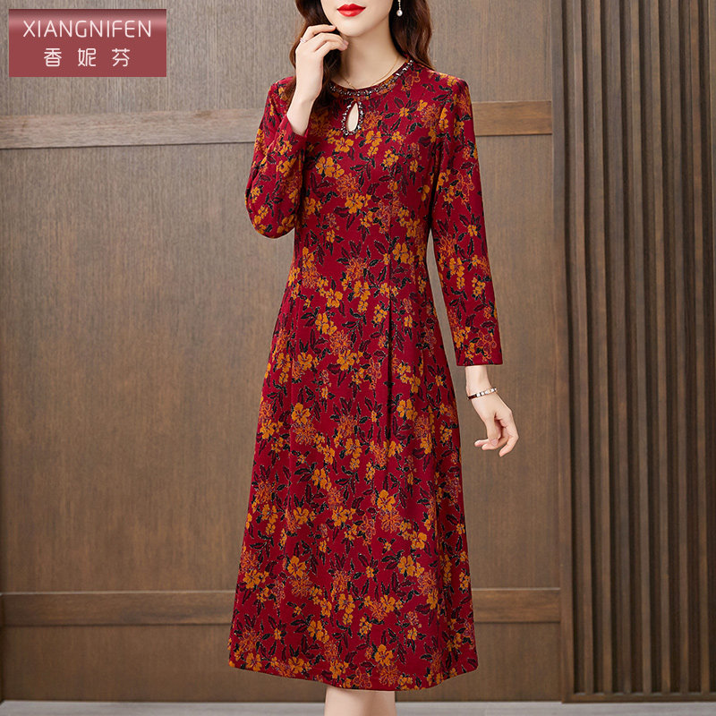 香妮芬红色时尚洋气中年妈妈连衣裙女2025新款秋季高贵优雅羊绒裙