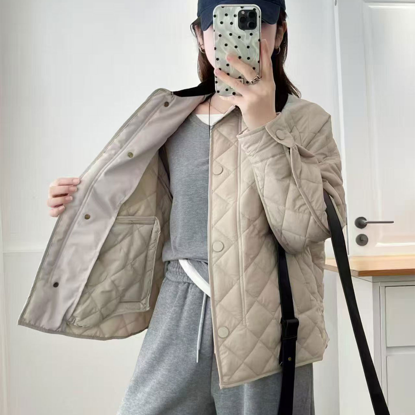 韩版灯芯绒翻领拼接菱格棉服外套女秋冬2025新款显瘦薄款夹棉上衣
