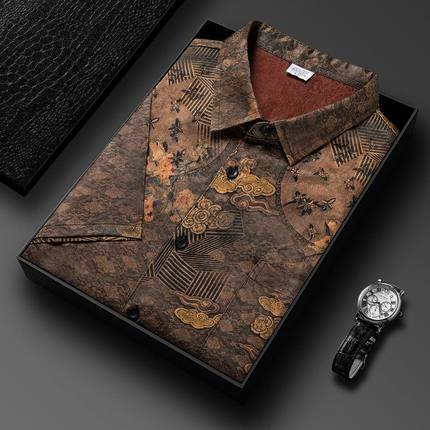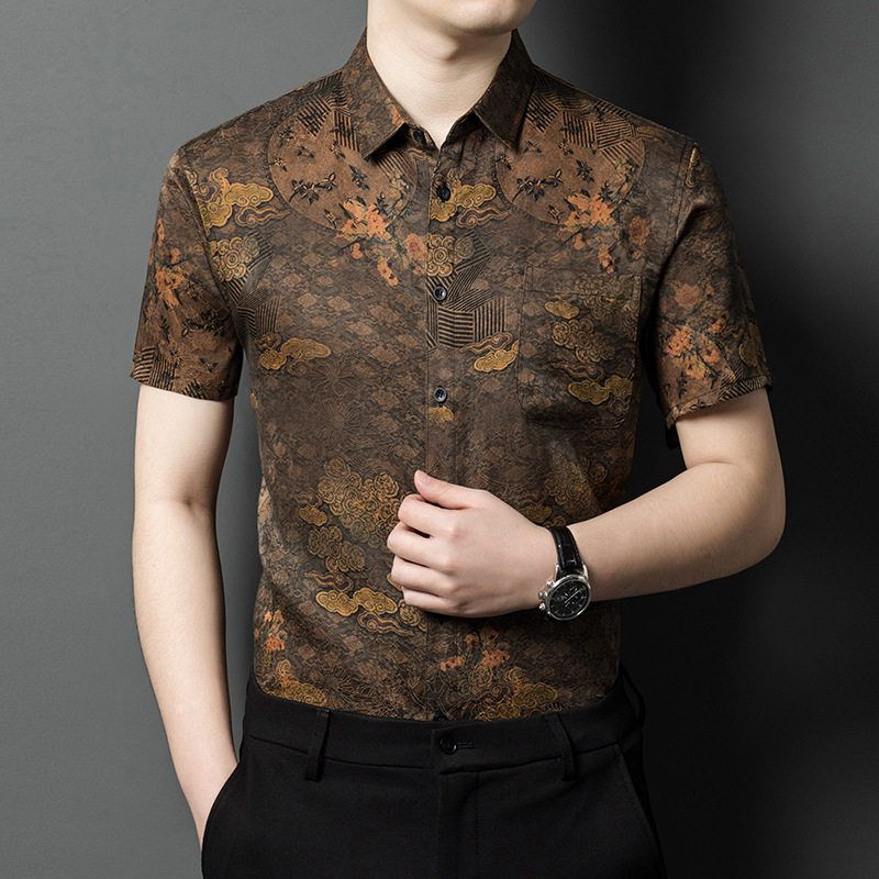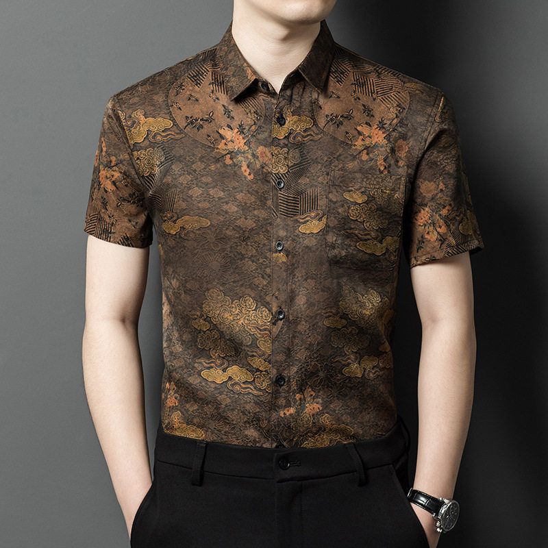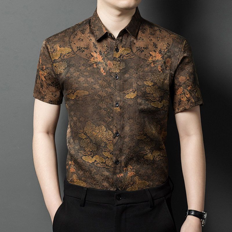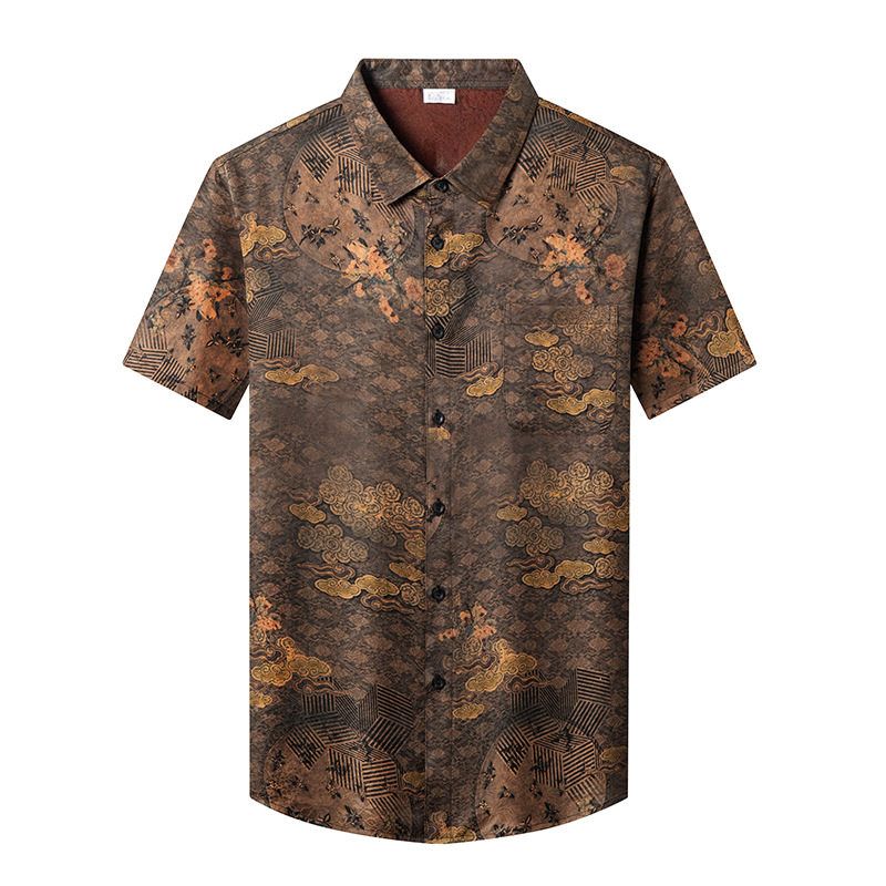桑蚕丝中国风中年男士短袖衬衫2025新款夏季香云纱真丝印花上衣男