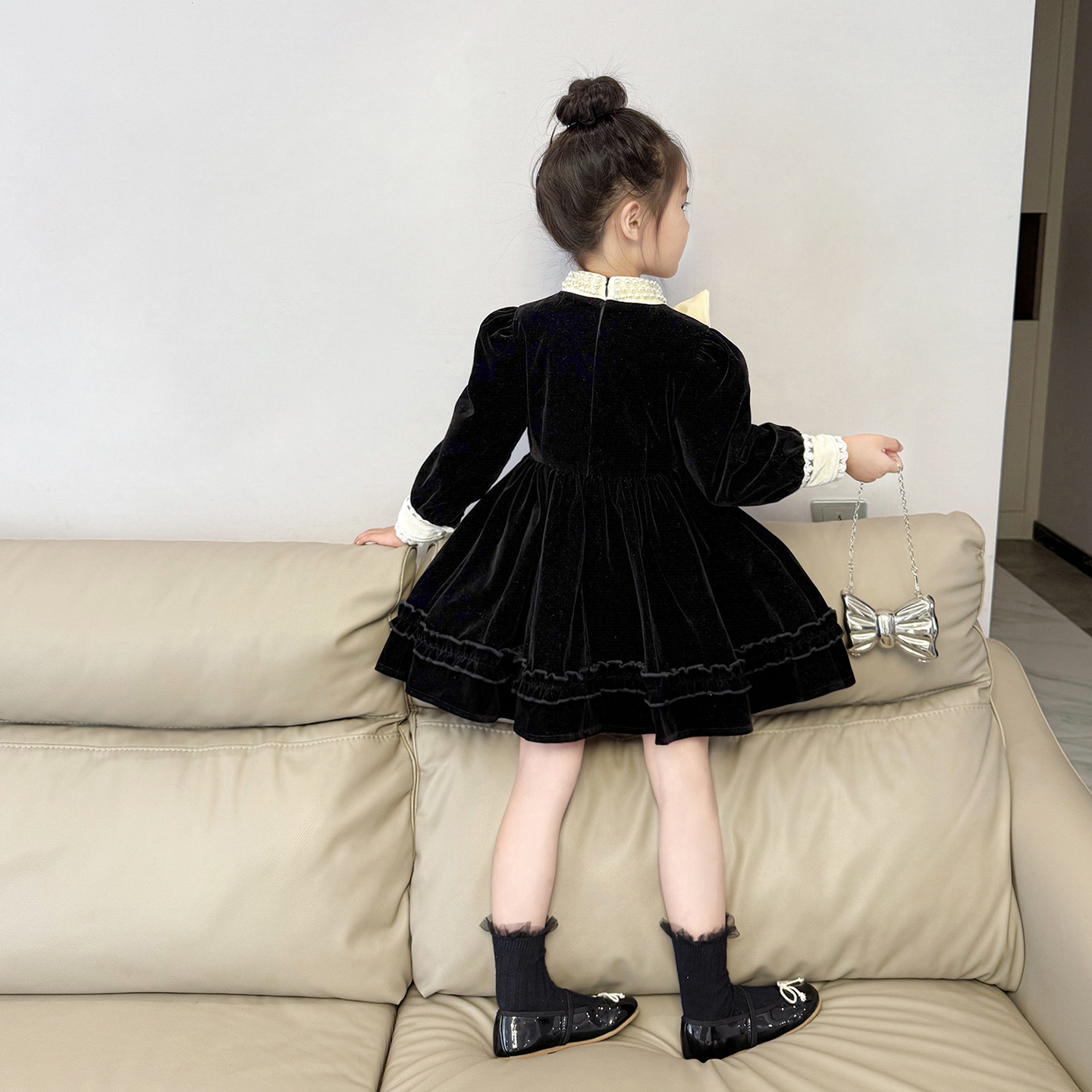 女童赫本风珍珠领丝绒裙连衣裙酷