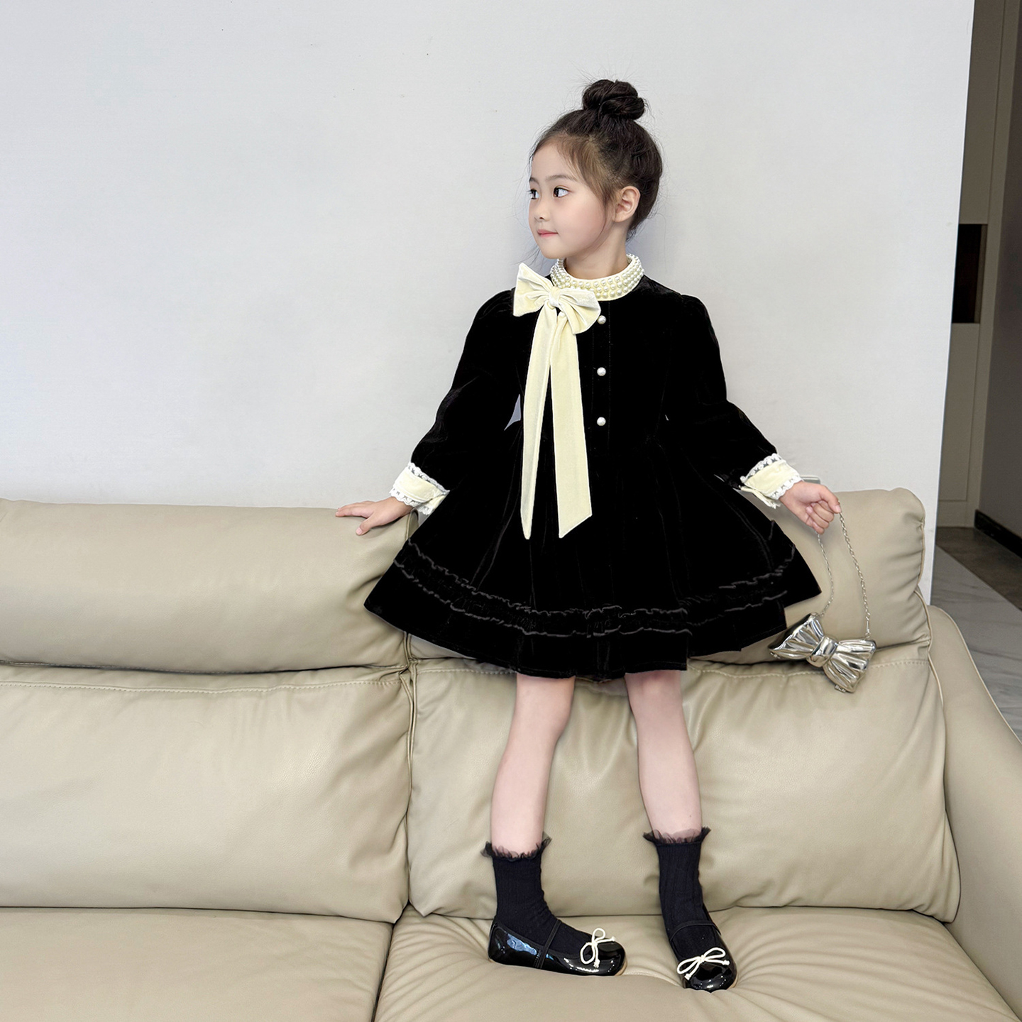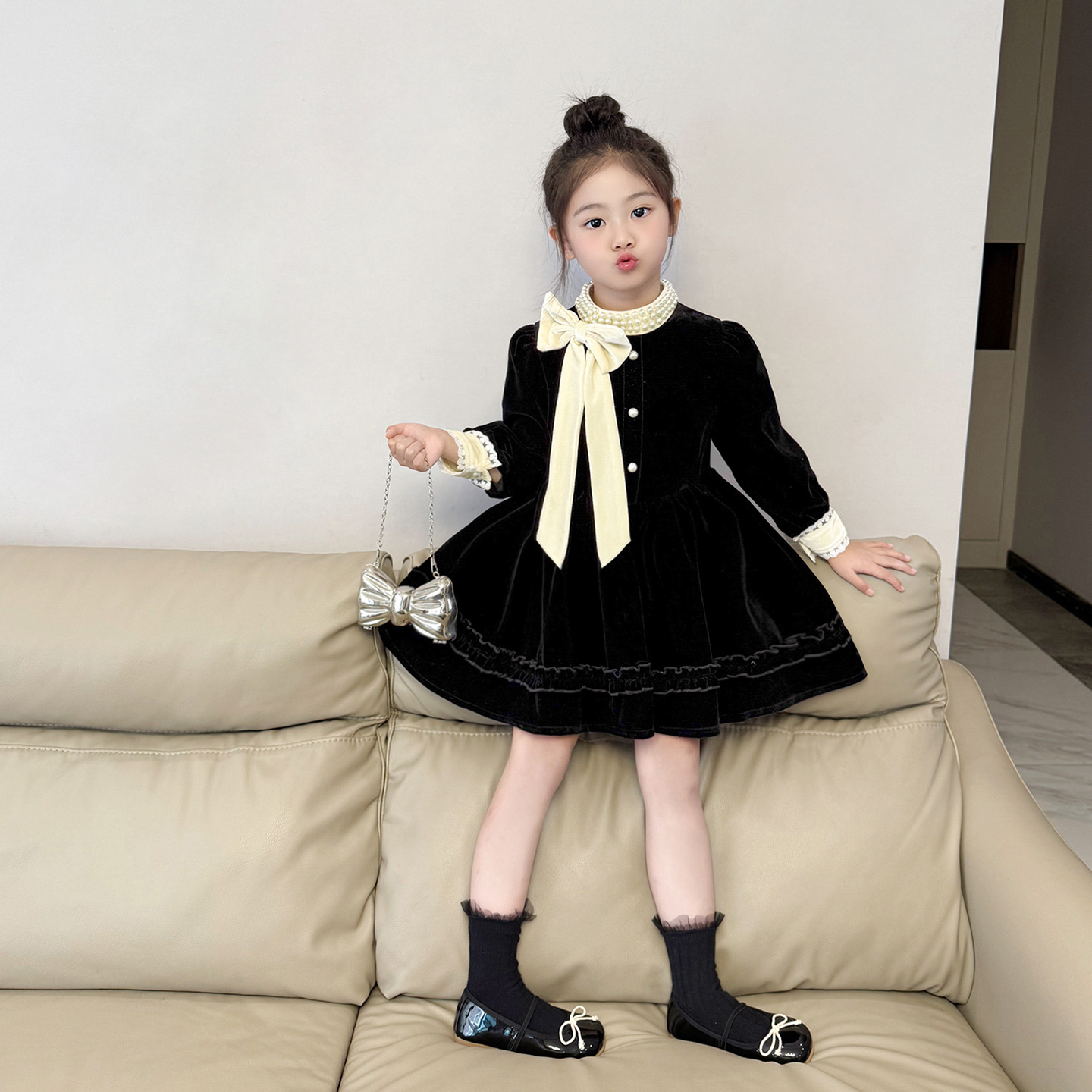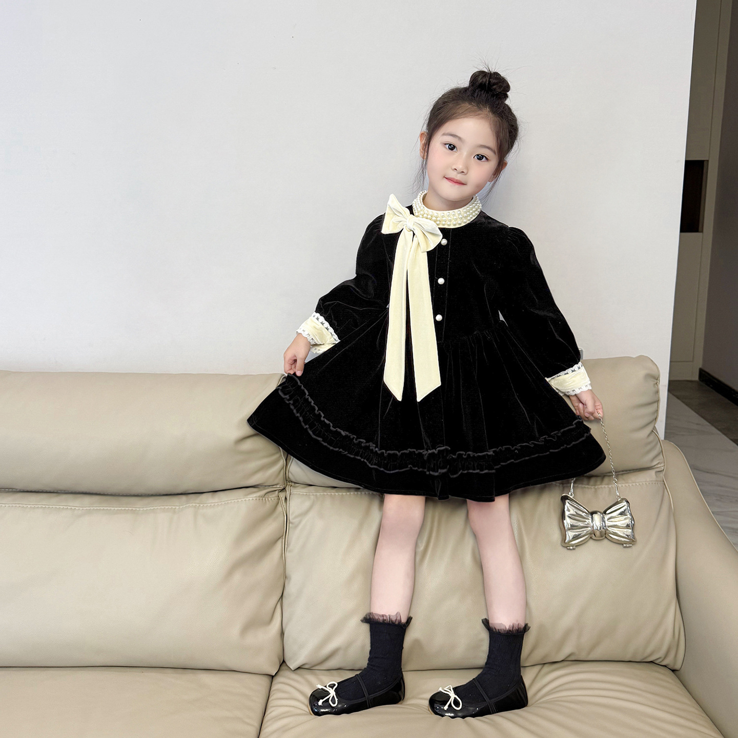 女童赫本风珍珠领丝绒裙连衣裙2025秋冬新款小女孩高级感公主裙子