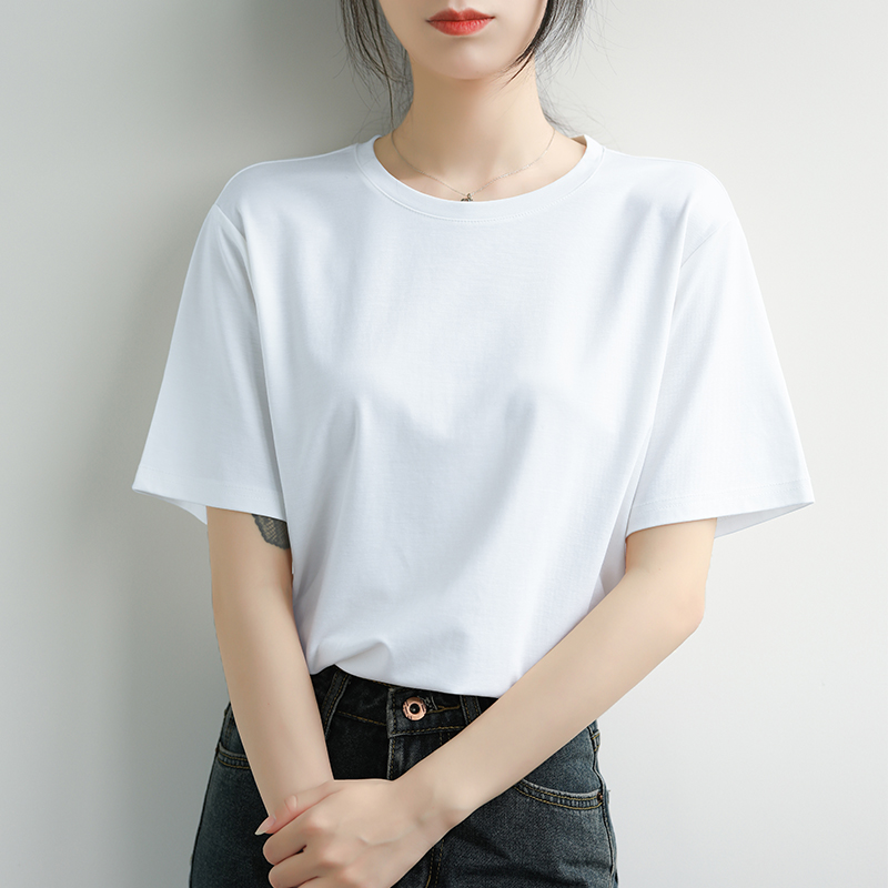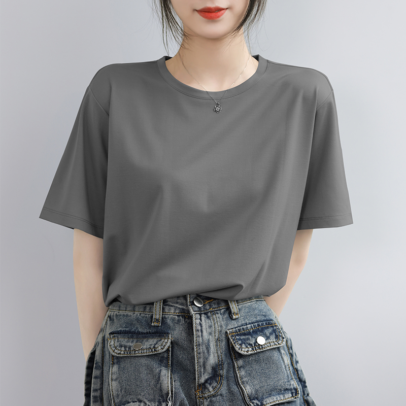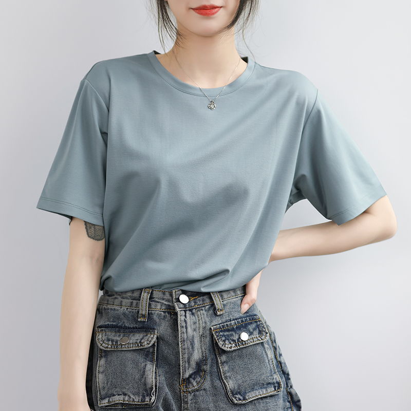 灰蓝色纯棉短袖t恤女夏季宽松体恤纯色简约质感正肩半袖上衣薄款