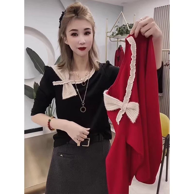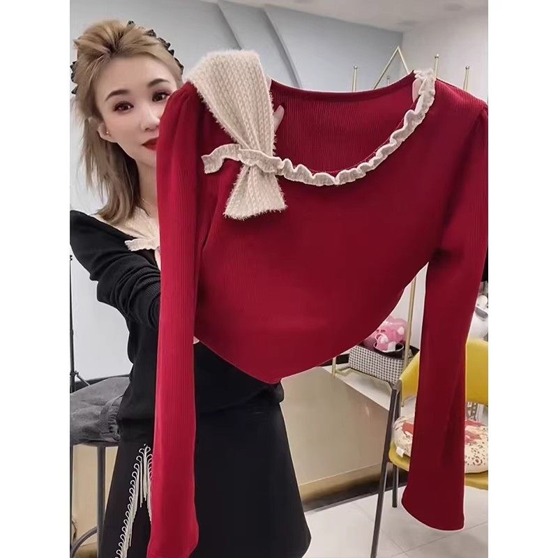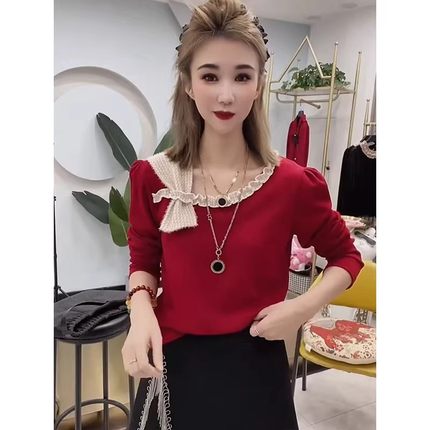 韩版斜肩蝴蝶结修身长袖T恤女