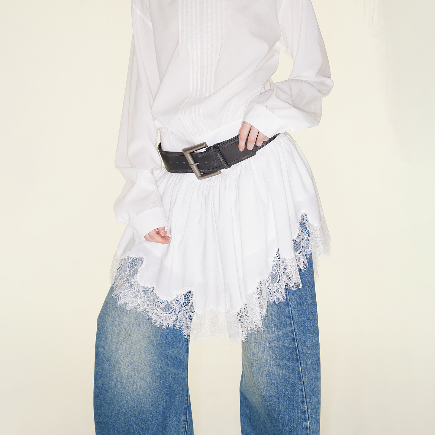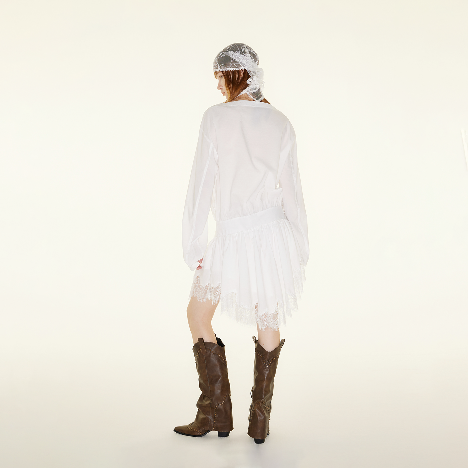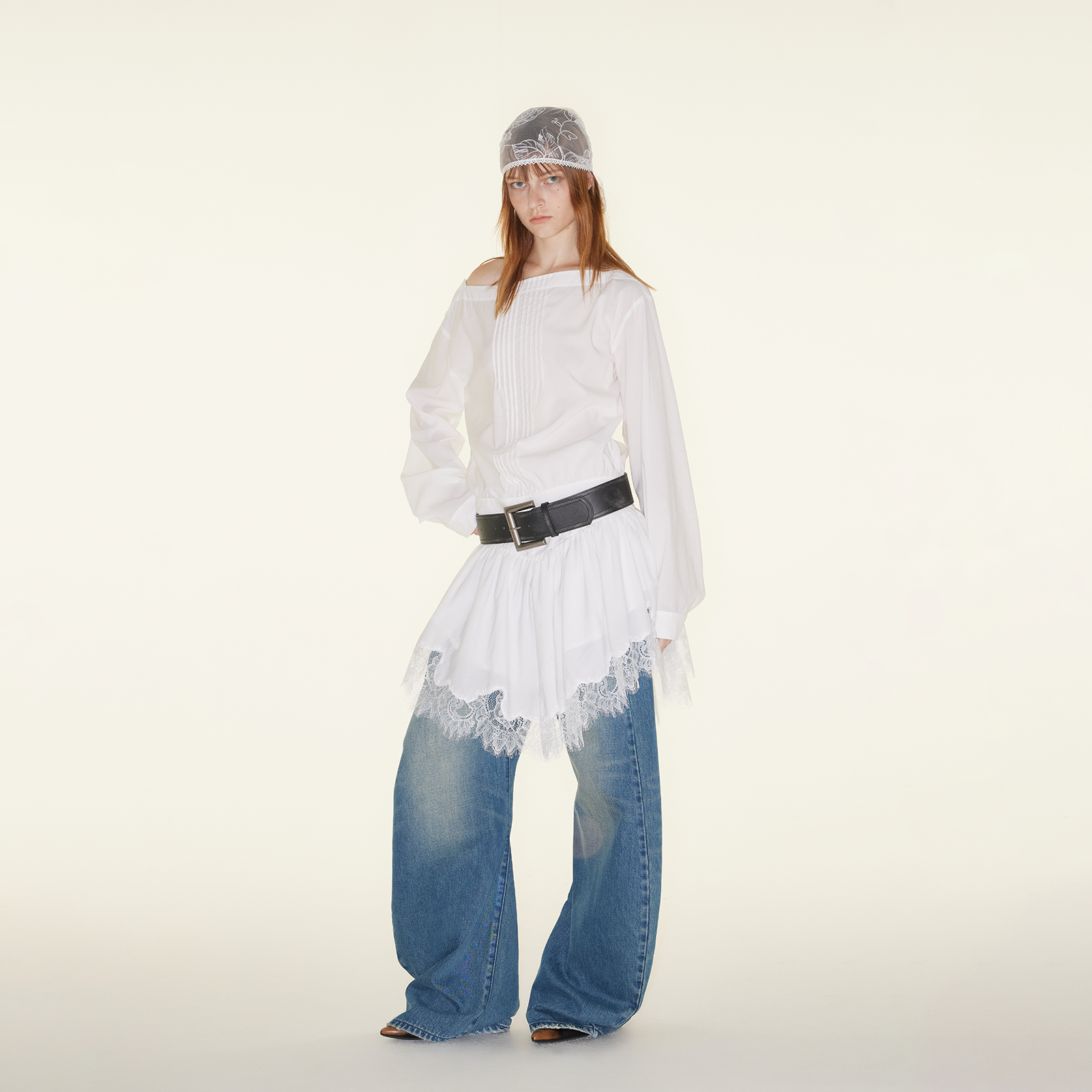 RURE白色一字肩蕾丝裙摆连衣裙
