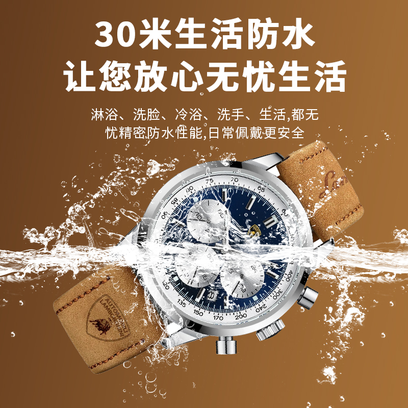 兰博基尼联名限定款真皮磨砂商务男士手表三眼六针多功能防水腕表