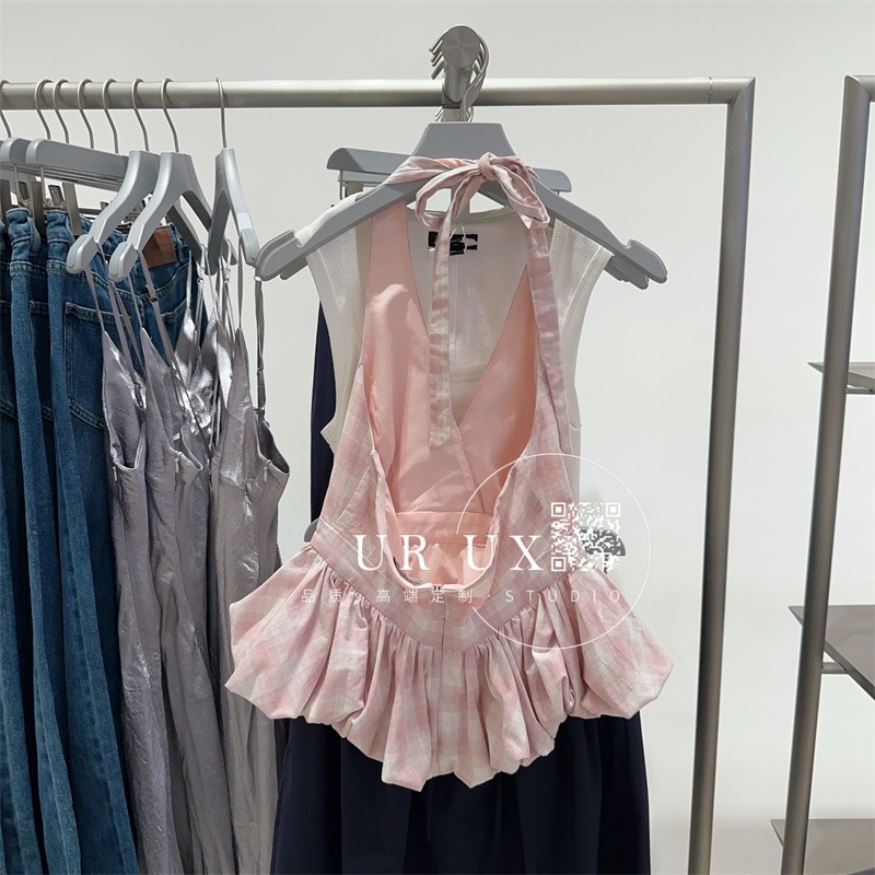 UR UX2025夏装新款女装复古显瘦格子甜美风挂脖无袖衬衫上衣
