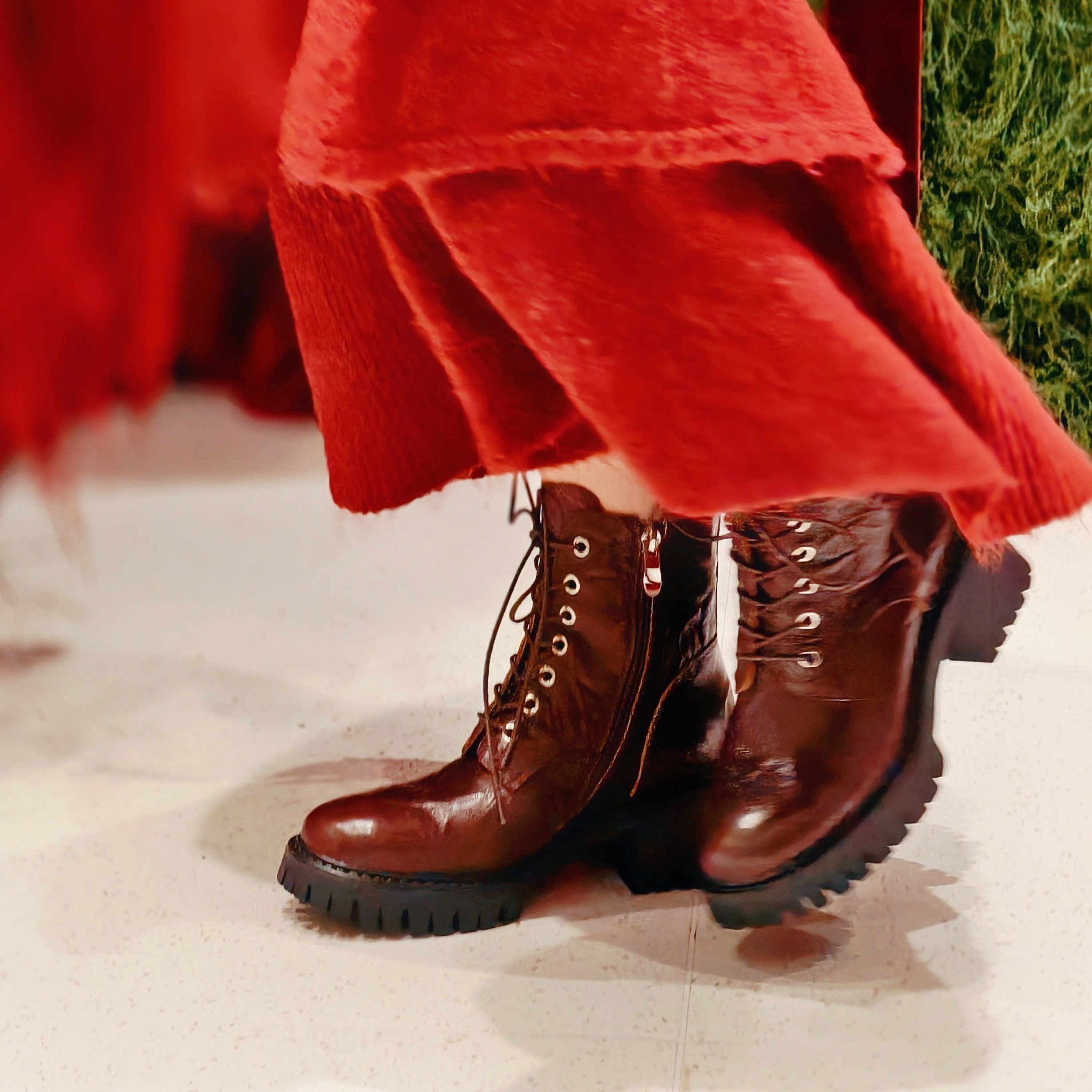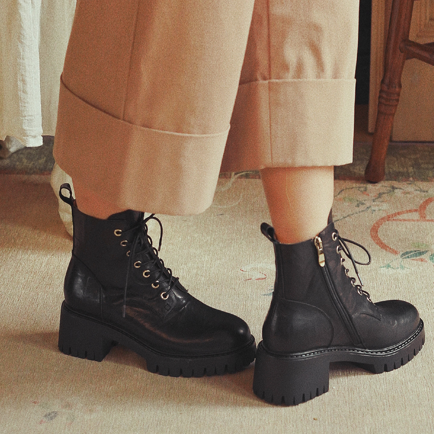 奈里复古牛皮厚底粗中跟马丁靴圆头系带气质小个子英伦风女工装靴