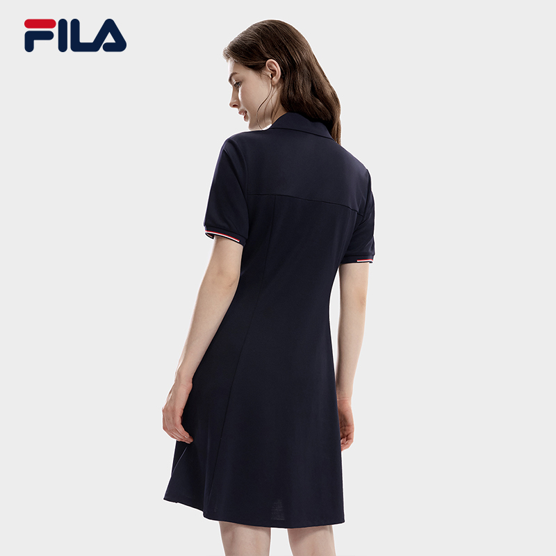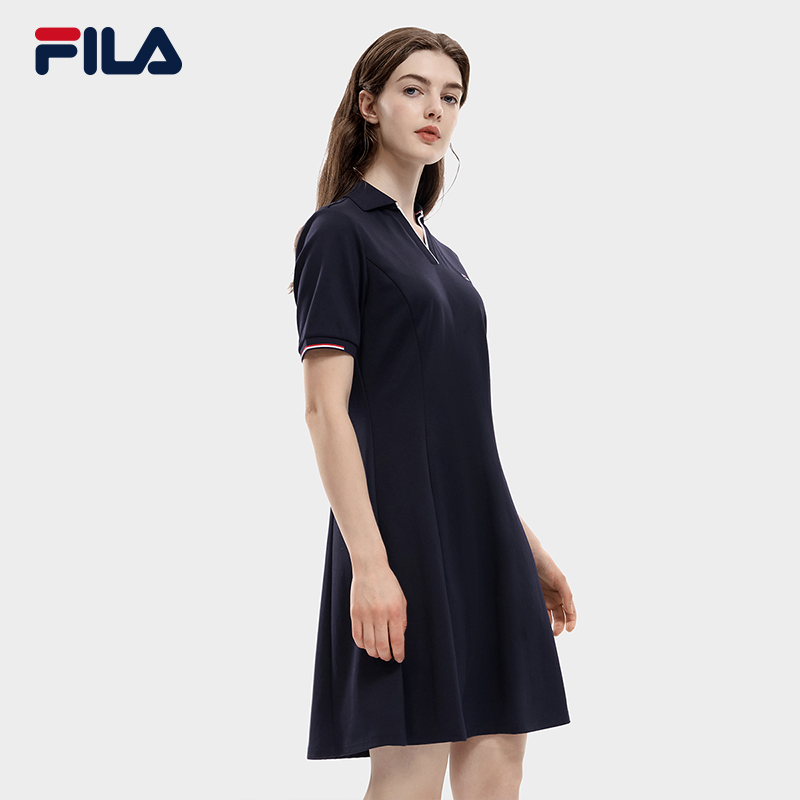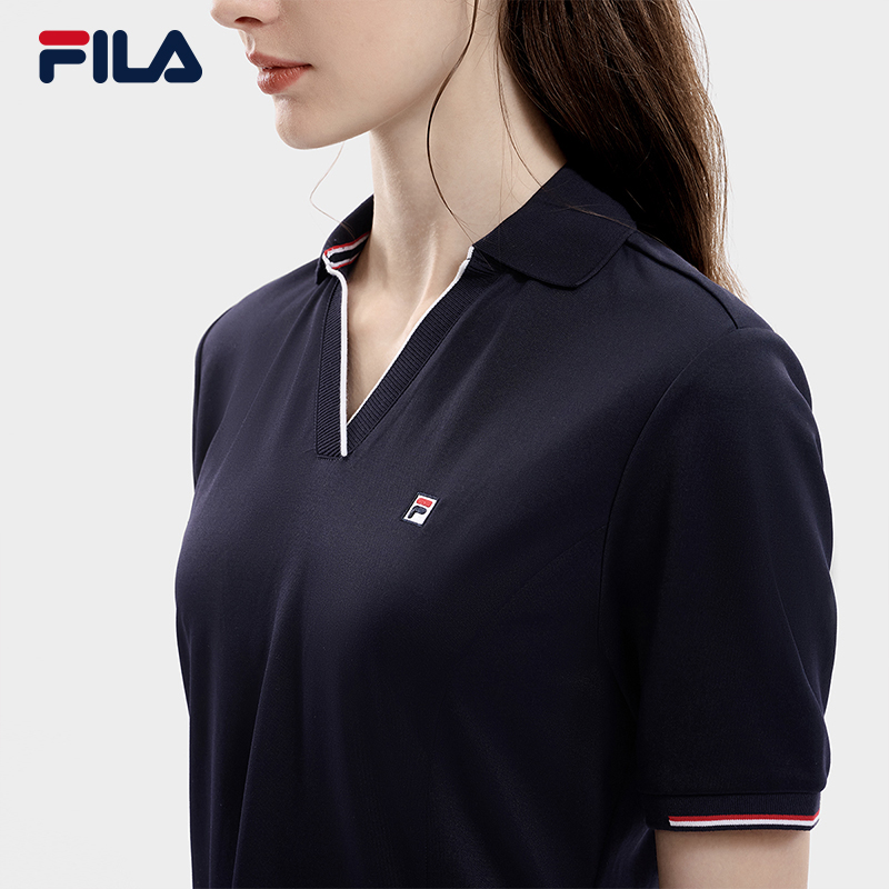FILA 斐乐官方女士针织连衣裙2023秋简约V翻领短袖休闲运动裙