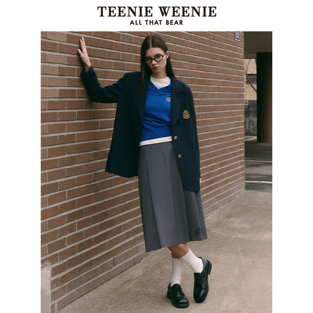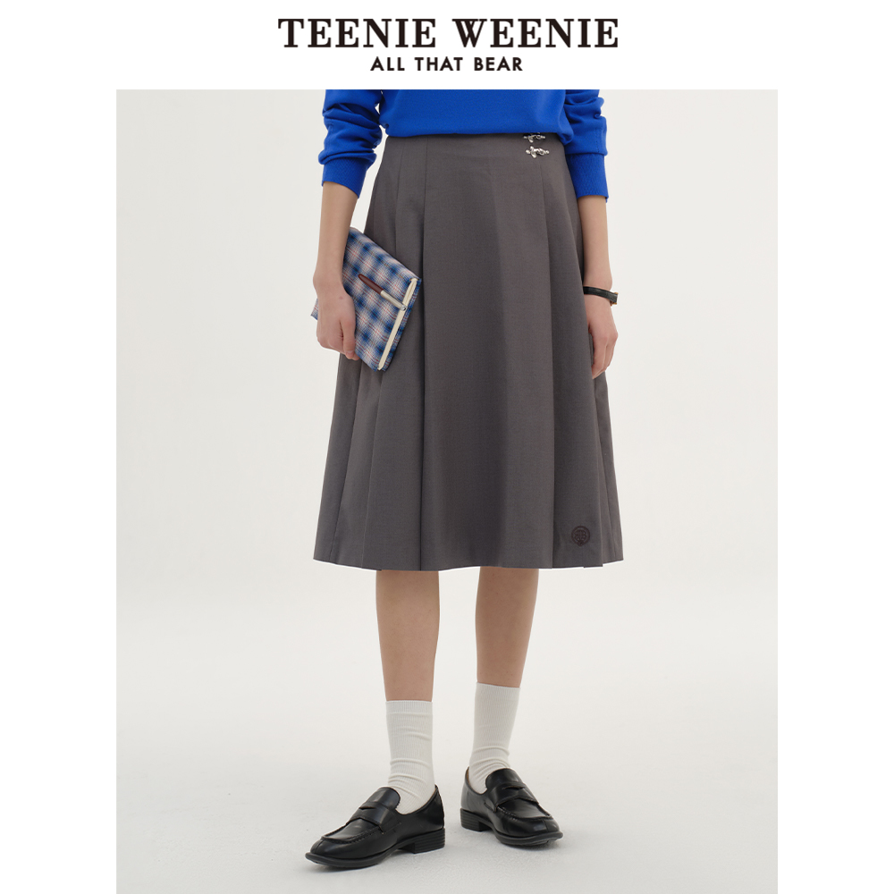 TeenieWeenie小熊中长百褶裙学院大摆半身裙卡其色A字裙知识分子